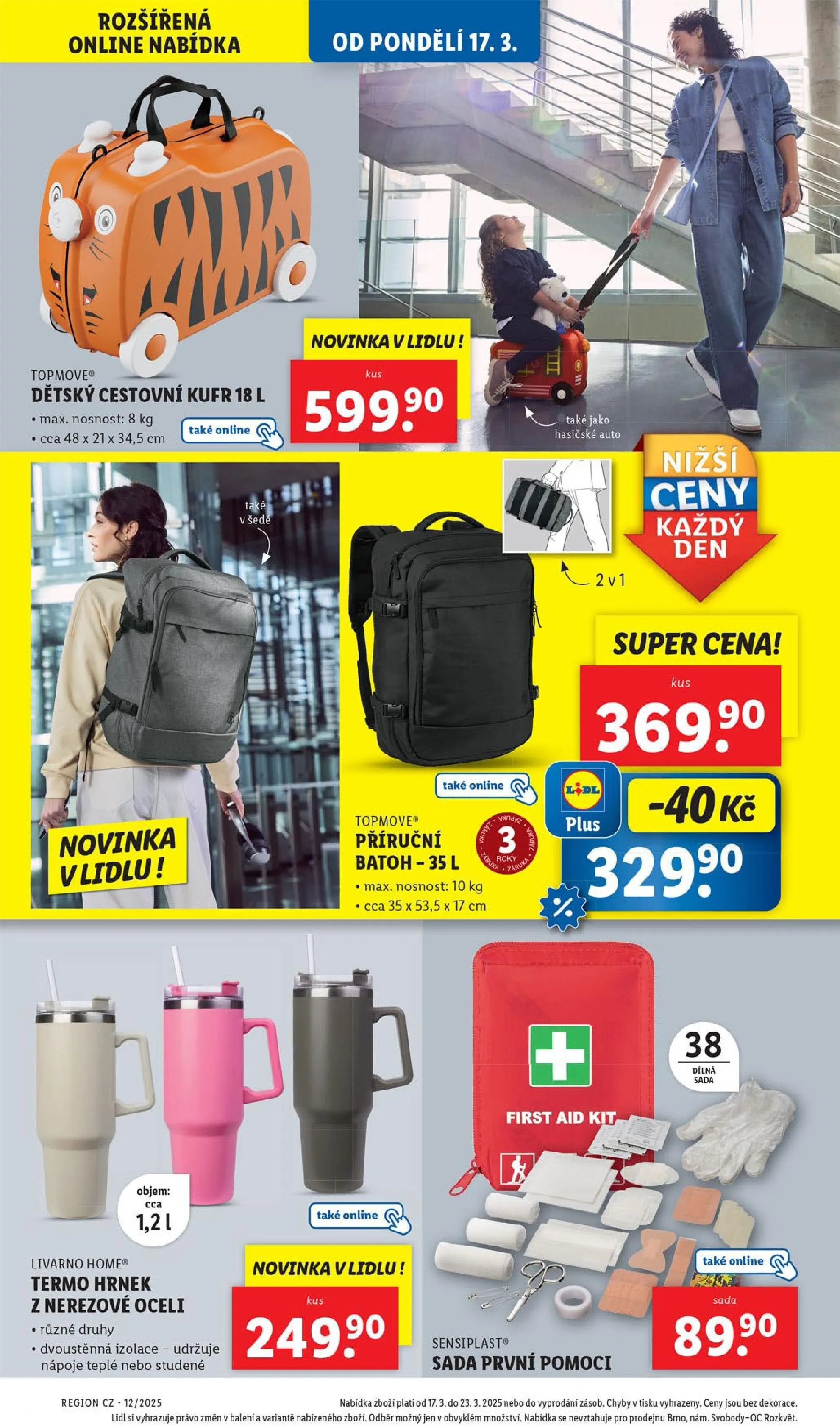 V letáku obchodu Lidl najdete širokou nabídku nových produktů, které potěší celou rodinu. Mezi novinkami se objevuje dětský cestovní kufr značky Topmove s objemem 18 l a maximální nosností 8 kg, ideální pro malé cestovatele. Dále nabízíme termo hrnek Livarno Home z nerezové oceli, který díky dvoustěnné izolaci udržuje nápoje teplé nebo studené.