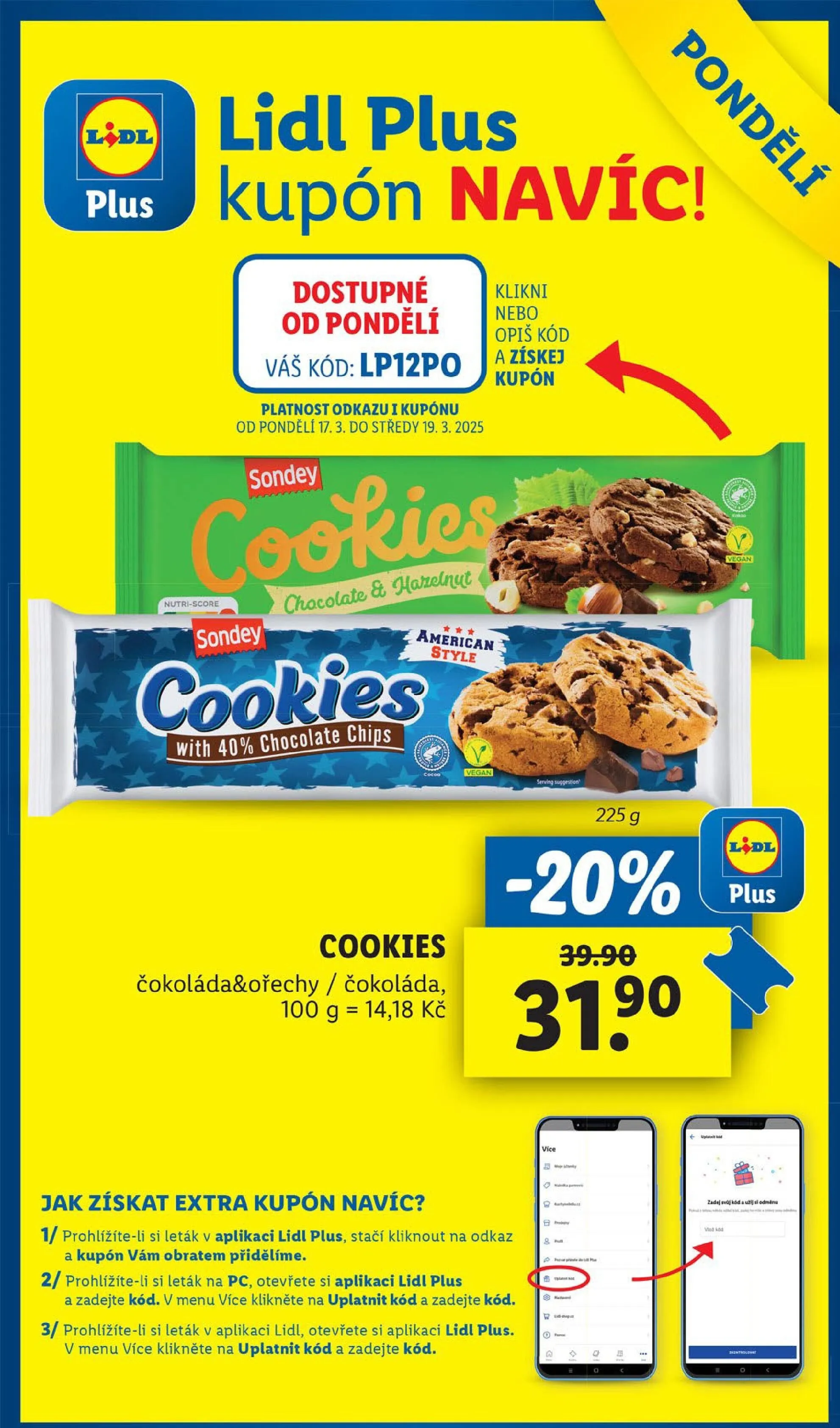 V letáku obchodu Lidl najdete skvělé nabídky, které potěší každého zákazníka. Od pondělí 17.3. do středy 19.3.2025 můžete využít speciální kupón s kódem lp12po a získat tak extra slevu. Mezi lákavé produkty patří cookies s čokoládovými chipsy, které jsou dostupné v balení 225 g. Tyto lahodné sušenky s nutri-score a americkým stylem jsou ideální pro každou příležitost. Nezapomeňte, že pro získání kupónu stačí kliknout na odkaz v aplikaci Lidl Plus nebo zadat kód. Ušetřete a vychutnejte si skvělé produkty!