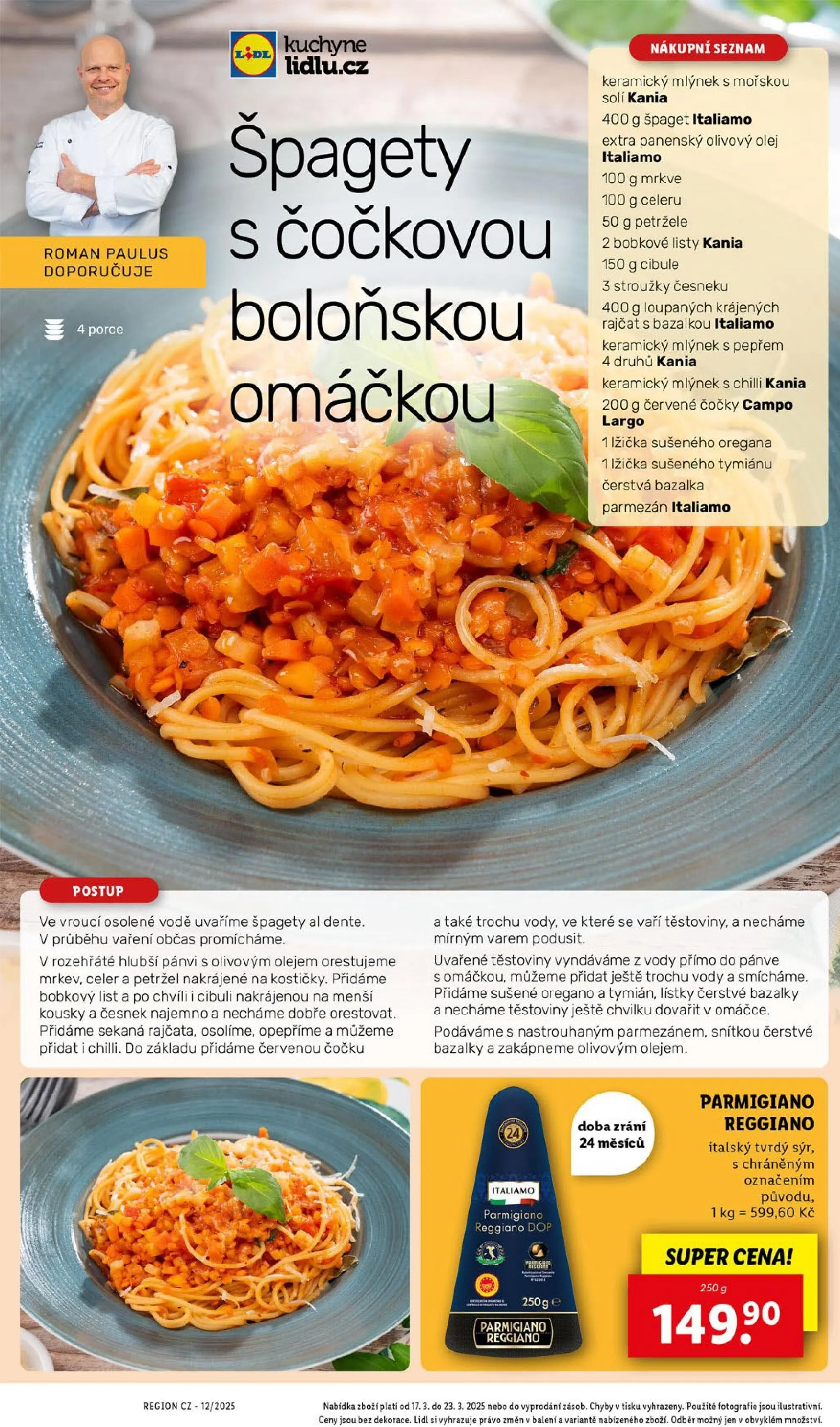 V letáku obchodu Lidl najdete skvělý recept na špagety s čočkovou boloňskou omáčkou, který doporučuje Roman Paulus. Tento pokrm je ideální pro čtyři porce a jeho příprava je jednoduchá. K přípravě budete potřebovat kvalitní suroviny, jako jsou 400 g špaget Italiamo, 200 g červené čočky Campo Largo, čerstvou zeleninu a bylinky. Nezapomeňte na extra panenský olivový olej a parmezán Italiamo, který dodá pokrmu vynikající chuť.