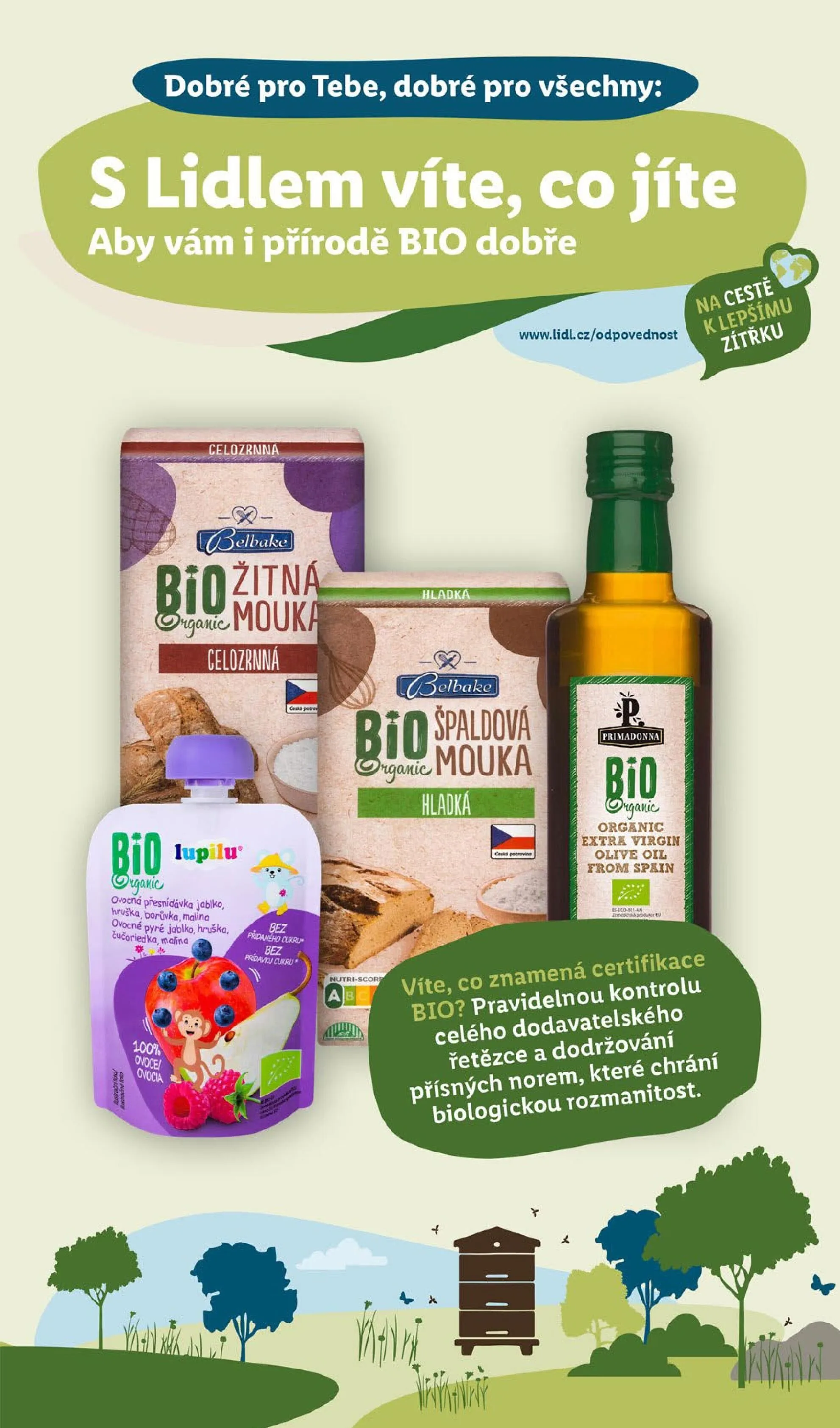 V letáku obchodu Lidl najdete širokou nabídku kvalitních produktů, které jsou dobré pro vás i pro přírodu. S našimi bio potravinami víte, co jíte, a můžete si být jisti, že splňují přísné normy ochrany biologické rozmanitosti. Nabízíme například lahodné ovoce jako borůvky a hrušky, které jsou skvělou volbou pro zdravou svačinu. Nezapomeňte také na naše extra panenské olivové oleje z certifikovaných zdrojů. S Lidlem se můžete těšit na chutné a zdravé produkty, které jsou šetrné k životnímu prostředí. Pro více informací navštivte naše stránky www.lidl.cz/odpovednost.