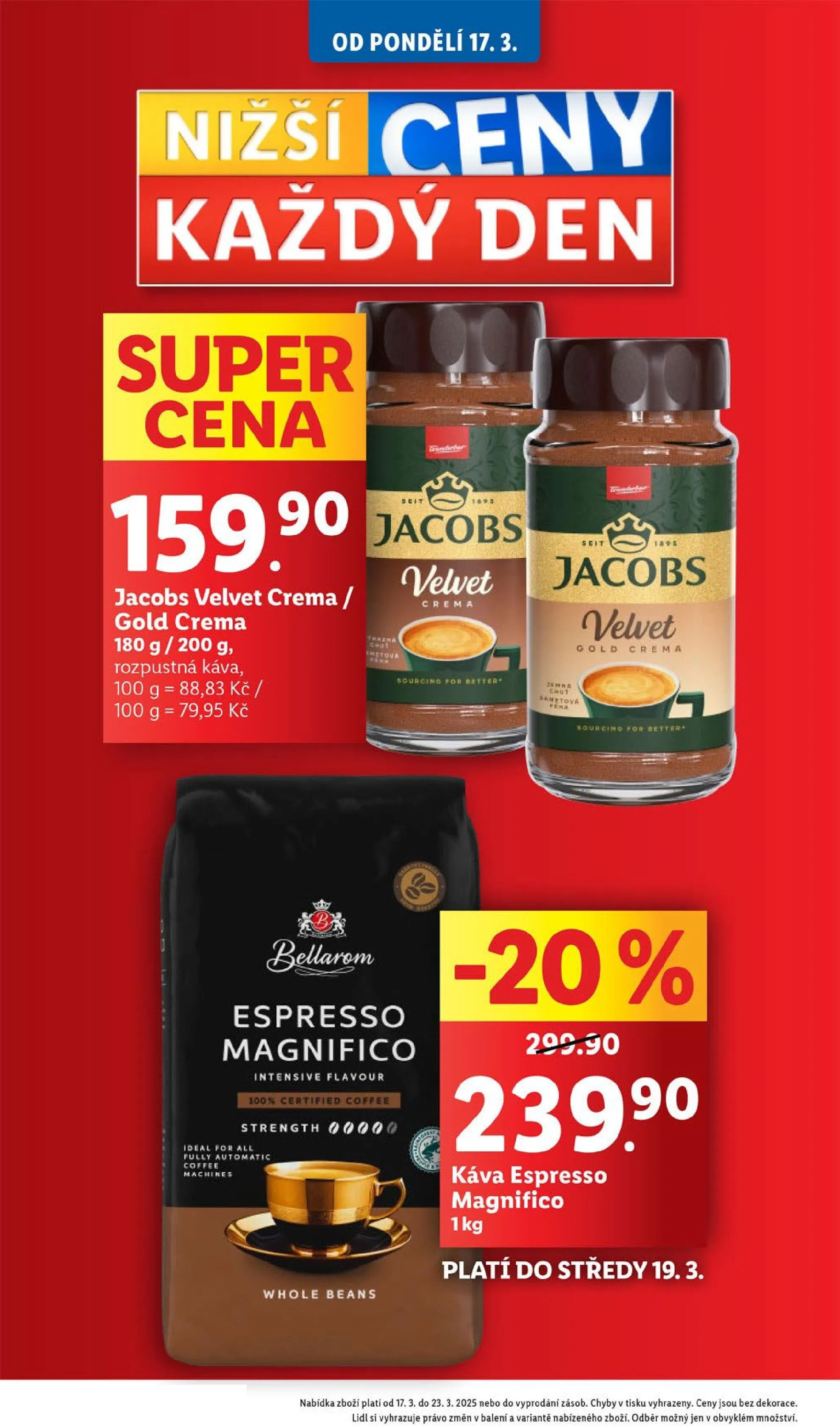 Od pondělí 17. března přichází Lidl s atraktivní nabídkou na kávu. V letáku najdete rozpustnou kávu Jacobs Velvet Crema a Gold Crema, které jsou k dispozici v balení 180 g a 200 g. Cena za 100 g je 88,83 Kč pro Velvet Crema a 79,95 Kč pro Gold Crema.