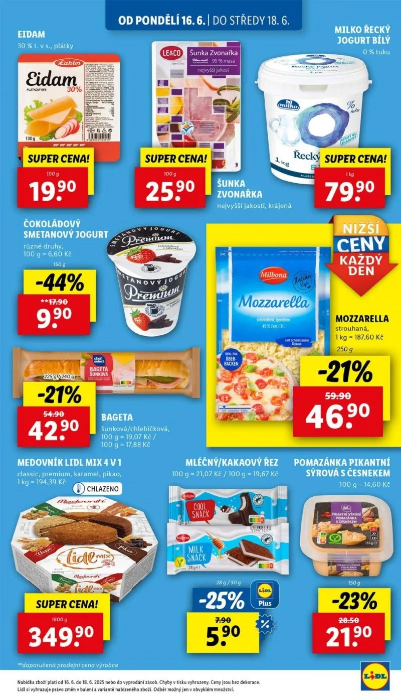 V letáku obchodu Lidl najdete skvělé nabídky na různé produkty! Mezi nimi se objevuje eidam 30 % v plátcích za super cenu 19,00 Kč. Dále si můžete vychutnat čokoládový smetanový jogurt různých druhů, který je k dostání za 6,60 Kč za 100 g.