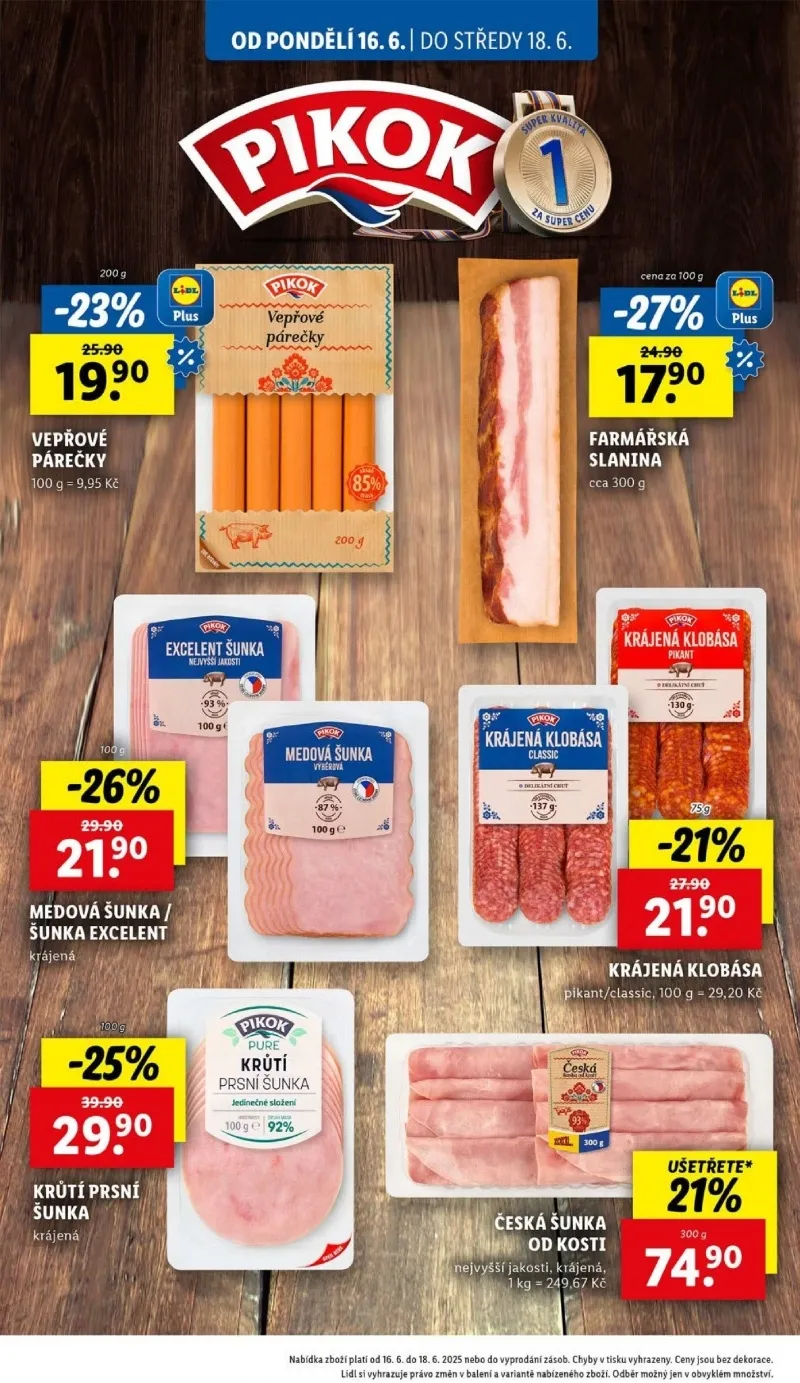 Od pondělí 16.6. do středy 18.6. si nenechte ujít skvělé nabídky v Lidlu! V našem letáku najdete vepřové párečky za 9,95 Kč/100 g a medovou šunku, která je nyní ve slevě -26%. Také nabízíme krůtí prsní šunku (krájenou) a farmářskou slaninu cca 300 g. Nezapomeňte na pikantní a classic krájenou klobásu, která je nyní za výhodnou cenu 29,20 Kč/100 g. A pro milovníky kvalitních masných výrobků máme českou šunku od kosti nejvyšší jakosti za 249,60 Kč/kg. Nabídka platí do vyprodání zásob. Těšíme se na vaši návštěvu!