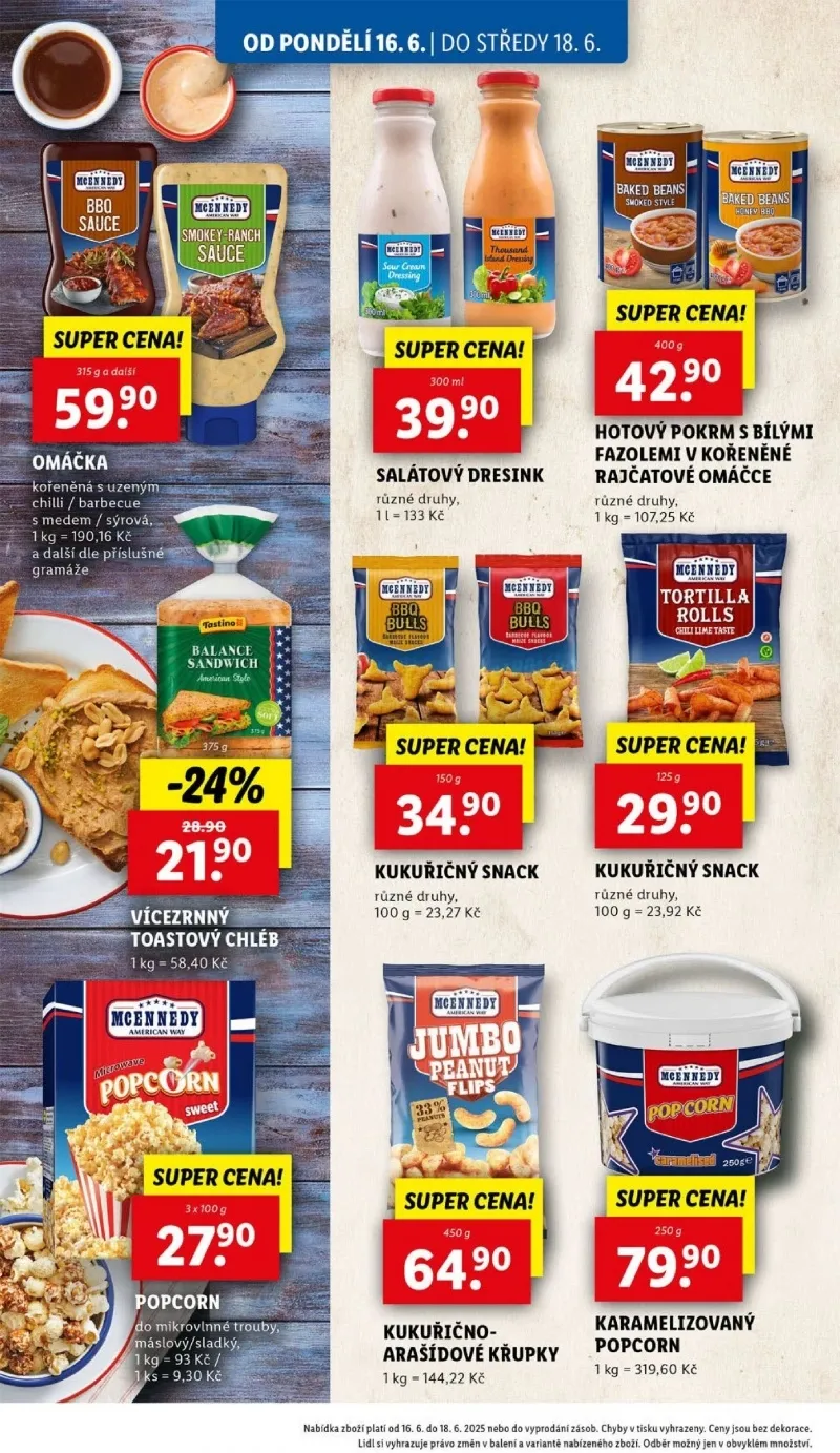 Od pondělí 16.6. do středy 18.6. si nenechte ujít skvělé nabídky v obchodě Lidl! V letáku najdete kořeněné omáčky s uzeným, chilli, barbecue, medem a sýrovou příchutí za super cenu 59 Kč. Dále nabízíme vícezrnný toastový chléb s 24% slevou, popcorn do mikrovlnné trouby v máslové a sladké variantě za 39 Kč, a různé druhy salátových dresinků.