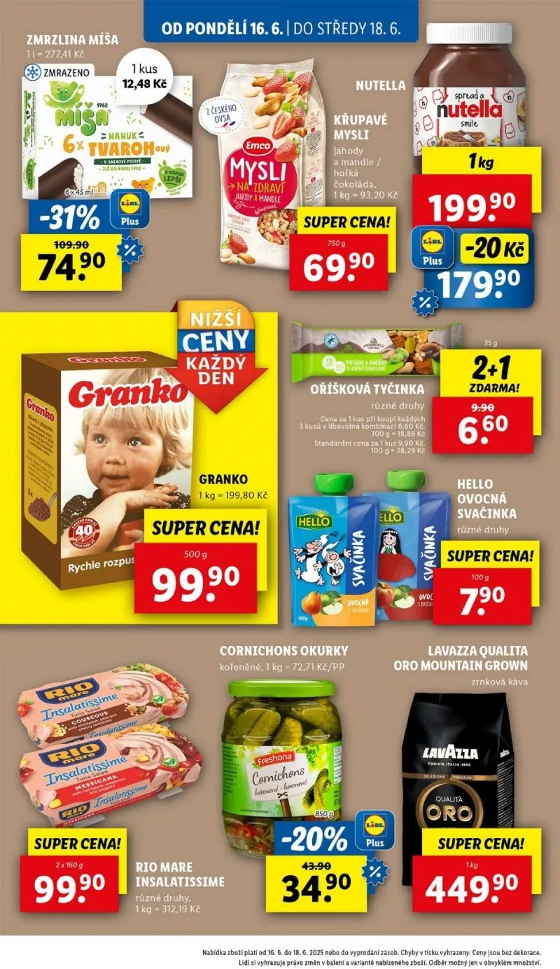 Od pondělí 16.6. do středy 18.6. si nenechte ujít skvělé nabídky v obchodě Lidl! V letáku najdete zmrzlinu v míse za super cenu 11,27 Kč za kus. Dále nabízíme Granko 1 kg za 199,80 Kč a Nutellu v křupavé variantě s jahodami a mandlemi za 93,20 Kč. Oříškové tyčinky jsou k dostání za 6,60 Kč při koupi více kusů. Nezapomeňte také na kořeněné okurky Cornichons za 72,71 Kč/kg a ovocné svačinky v různých druzích. Káva Lavazza Qualita a Rio Mare Insalatissime jsou také součástí této skvělé nabídky. Všechny ceny platí do vyprodání zásob. Těšíme se na vaši návštěvu!