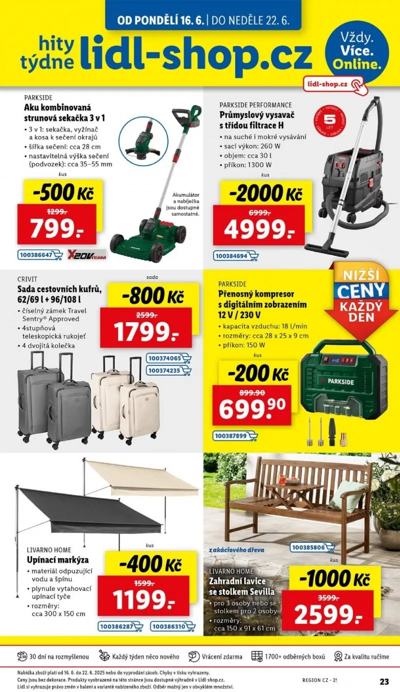 Od pondělí 16.6. do neděle 22.6. si v Lidlu můžete vybrat z široké nabídky produktů. Mezi hity týdne patří aku kombinovaná strunová sekačka 3 v 1, která nabízí sečení, vyžínání a kosení okrajů s šířkou sečení cca 28 cm. Dále si můžete pořídit sadu cestovních kufrů s číselným zámkem a teleskopickou rukojetí. Pro zahradníky je tu zahradní lavice se stolkem pro 3 osoby, ideální pro relaxaci na zahradě. Nezapomeňte také na průmyslový vysavač s třídou filtrace H, který je vhodný pro suché i mokré vysávání. A pro ty, kteří potřebují vzduchový kompresor, je k dispozici přenosný model s digitálním zobrazením. Všechny produkty jsou k dispozici online na lidl-shop.cz. Ceny jsou bez dekorace a nabídka platí do vyprodání zásob.