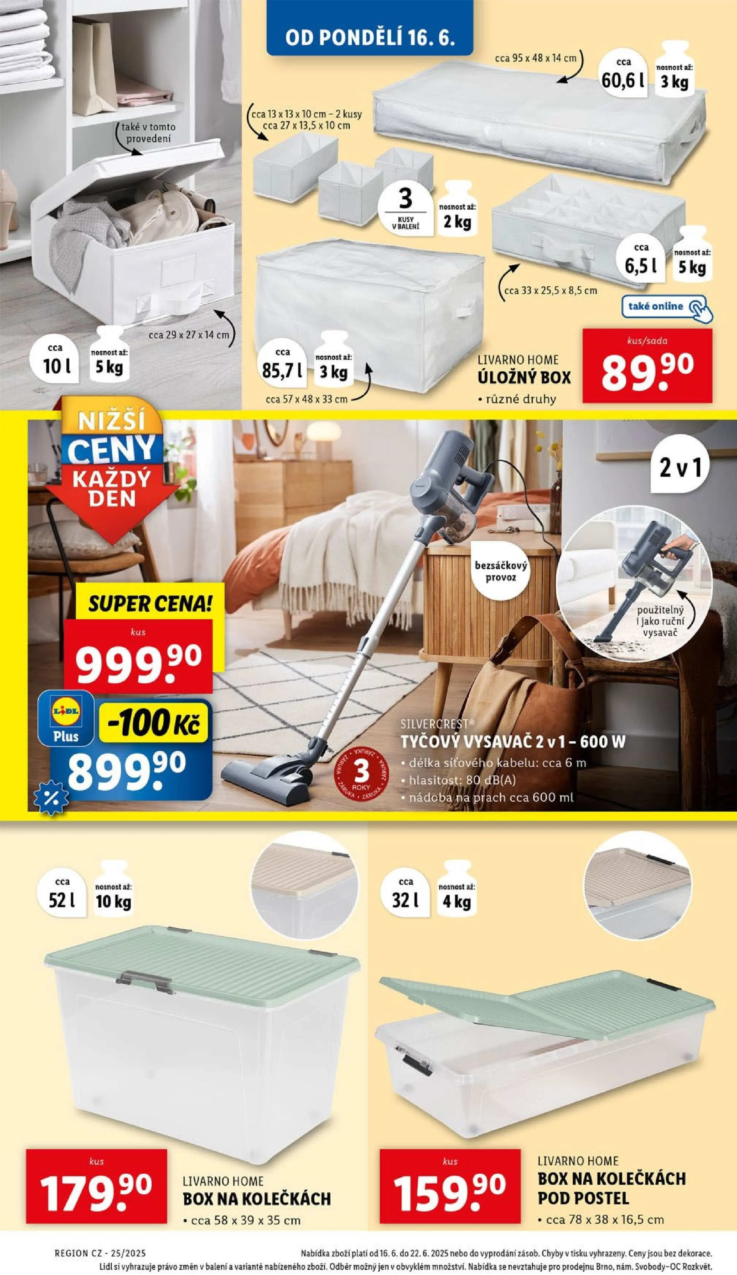 Od pondělí 16. června si v Lidlu můžete vybrat z široké nabídky produktů. V akci jsou úložné boxy Livarno Home v různých provedeních, ideální pro organizaci vašeho prostoru. Dále nabízíme bezsáčkový tyčový vysavač 2v1, který lze použít i jako ruční vysavač, s dosahem až 6 metrů a objemem nádoby 600 ml.