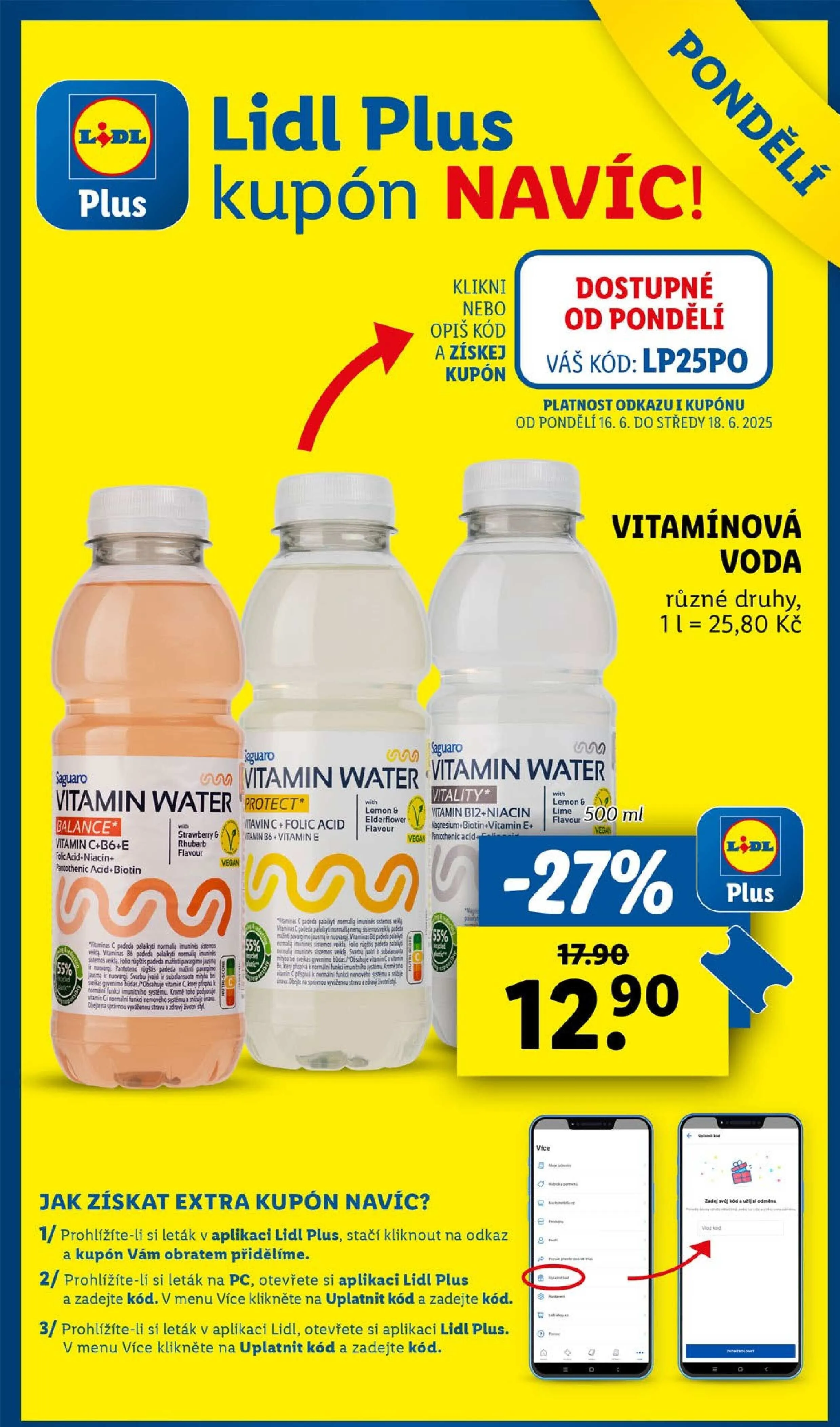 V letáku obchodu Lidl najdete skvělé nabídky, včetně vitamínové vody různých příchutí za cenu 25,80 Kč za 500 ml. Nezapomeňte využít speciální kupón, který můžete získat snadno kliknutím na odkaz v aplikaci Lidl Plus nebo zadáním kódu lp25po. Tento kupón je platný od pondělí 16.6. do středy 18.6.2025. Nepropásněte šanci na extra slevu a užijte si osvěžující nápoje plné vitamínů!