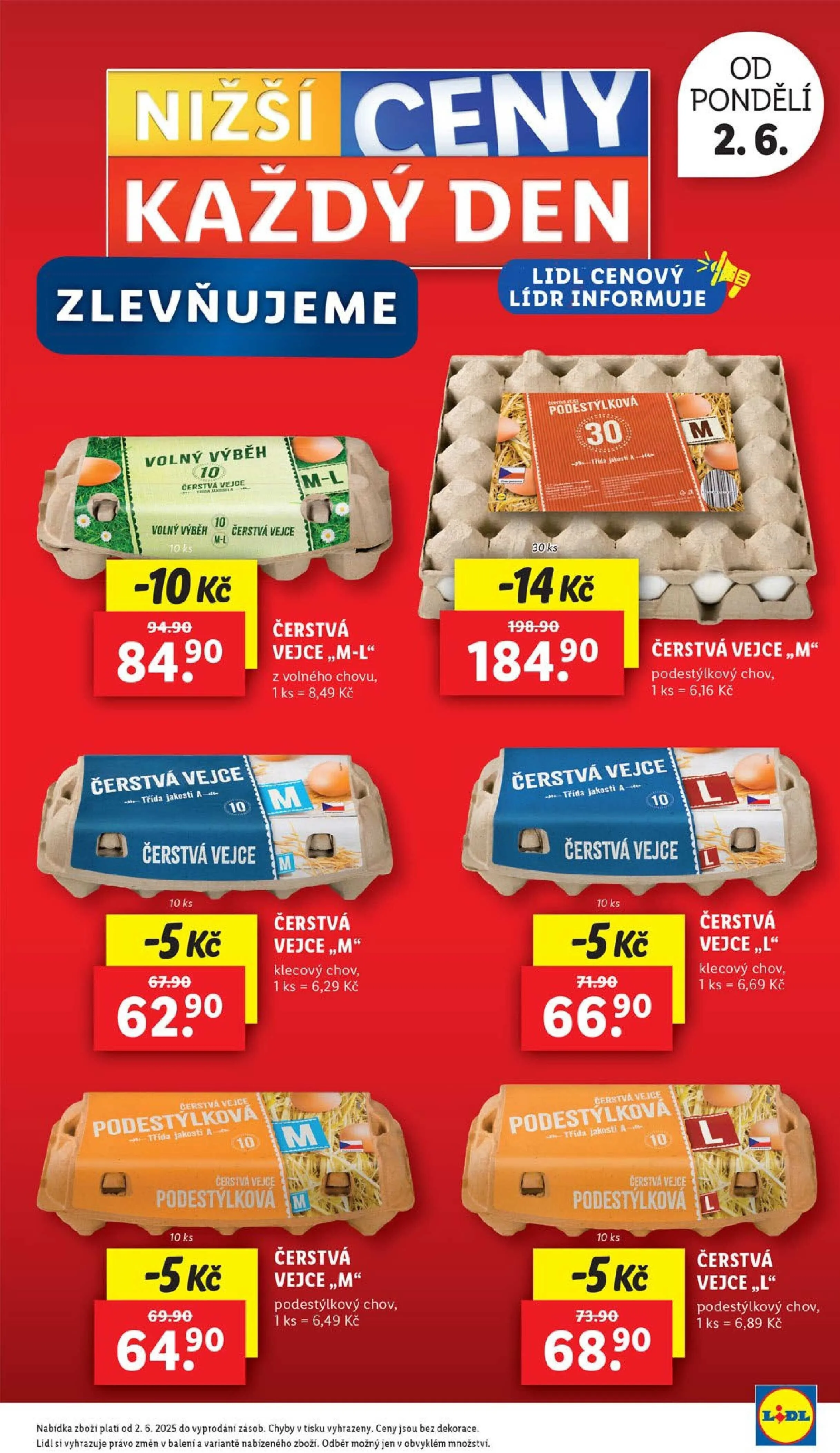 V letáku obchodu Lidl najdete širokou nabídku čerstvých vajec z různých chovů. Nabízíme vejce z volného chovu, která jsou k dostání za 8,49 Kč za kus. Dále máme vejce z podestýlkového chovu, kde cena začíná na 6,49 Kč za kus. Pro zákazníky, kteří preferují klecový chov, nabízíme vejce za 6,29 Kč za kus. Všechny produkty jsou dostupné v baleních po 10 kusech, s různými cenovými slevami. Akce platí od 2.6.2025 do vyprodání zásob. Nezapomeňte, že ceny jsou bez dekorace a Lidl si vyhrazuje právo na změny v nabídce.