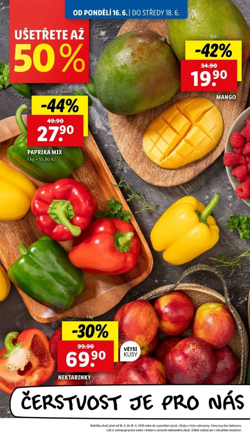 Od pondělí 16.6. do středy 18.6. máte jedinečnou příležitost ušetřit až 42% na vybraných produktech v obchodě Lidl. V nabídce najdete 500g balení šťavnatého manga za skvělou cenu. Dále si můžete pořídit paprika mix za 55,80 Kč za 1 kg, což představuje slevu 44%. Nezapomeňte také na čerstvé nektarinky, které jsou nyní k dostání se slevou 30%. Tato nabídka platí do vyprodání zásob, tak neváhejte a přijďte si vybrat! Ceny jsou uvedeny bez dekorace a Lidl si vyhrazuje právo na změny a možné množstevní omezení.