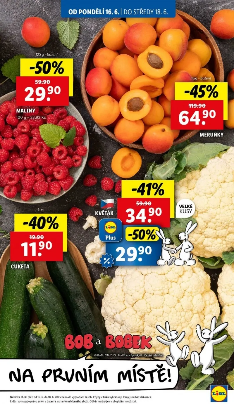 V letáku obchodu Lidl najdete skvělé akční nabídky od pondělí 16. 6. do středy 18. 6. Mezi produkty se slevou patří maliny v balení 125 g za 29,90 Kč (-50%), cuketa za 11,90 Kč (-40%) a velké meruňky, které jsou nyní za skvělou cenu. Nezapomeňte také na květák, který je k dostání se slevou 410%. Tato nabídka platí do vyprodání zásob, tak neváhejte a přijďte si vybrat!