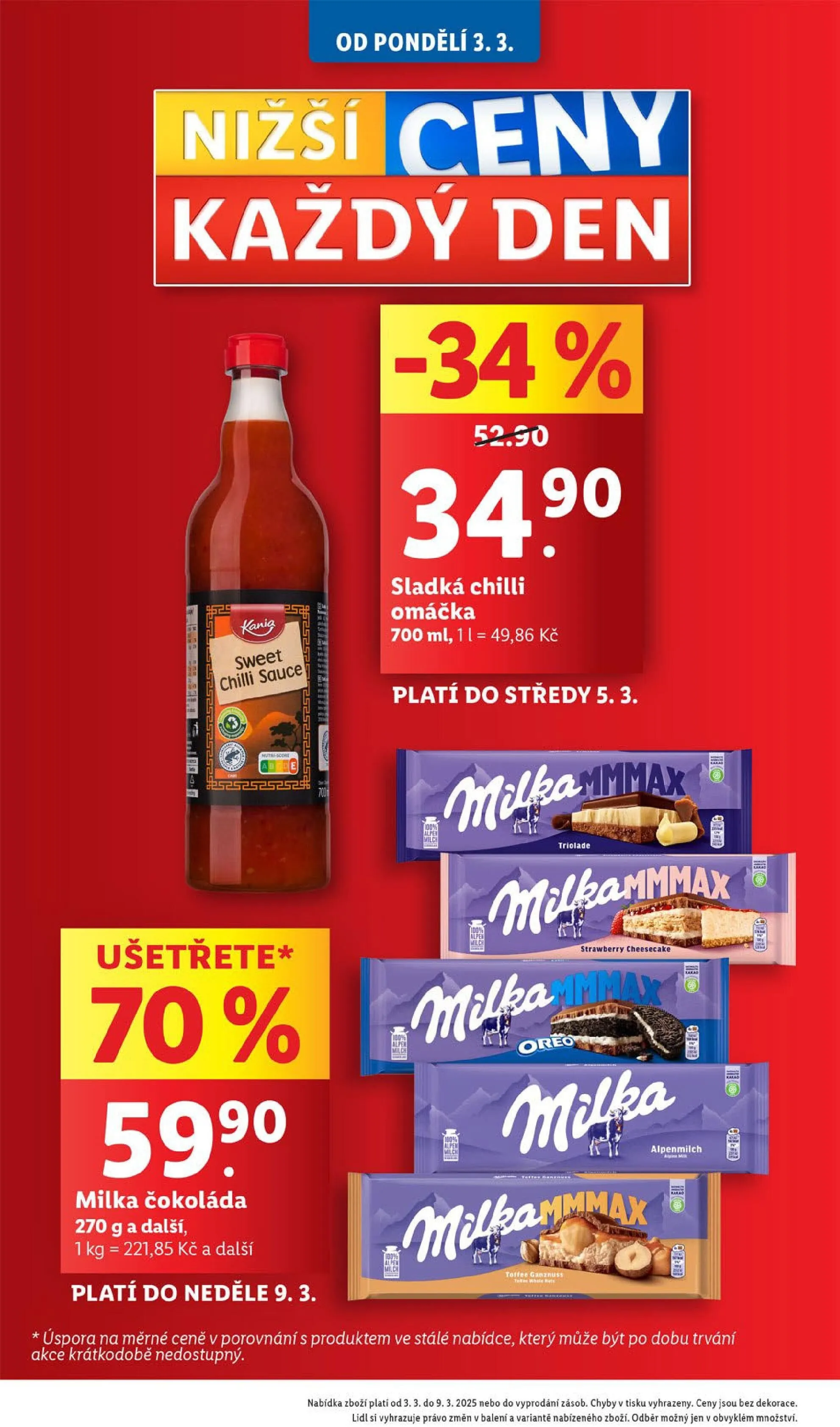 Od pondělí 3. března do neděle 9. března si můžete v Lidlu vychutnat skvělé nabídky! Ušetřete na Milka čokoládě 270 g, která je nyní za cenu 221,85 Kč za kilogram. Dále nabízíme sladkou chilli omáčku 700 ml za 49,86 Kč. Nezapomeňte, že úspora se vztahuje na měrné ceny v porovnání s produkty ve stálé nabídce. Nabídka platí do vyprodání zásob, tak neváhejte a přijďte si pro své oblíbené produkty!