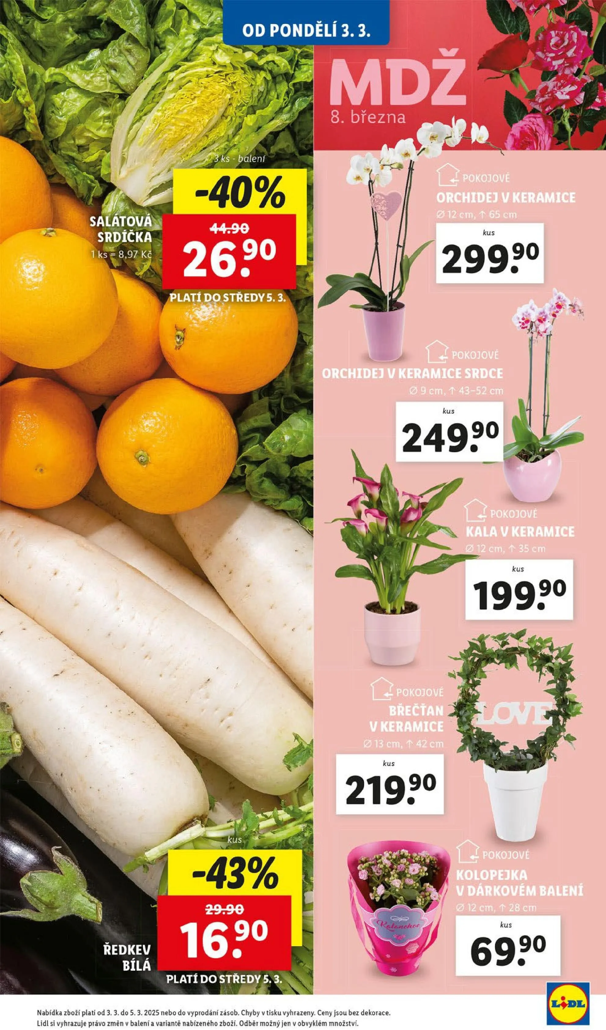 Od pondělí 3. března v obchodě Lidl najdete skvělou nabídku pokojových rostlin. Mezi nimi se objevují krásné orchideje v keramice, které jsou k dispozici ve dvou variantách: menší orchidej o průměru 12 cm a výšce 65 cm za 299 Kč a větší orchidej srdce o průměru 9 cm a výšce 43-52 cm za 249 Kč. Dále můžete zakoupit břečťan v keramice (13 cm, 42 cm) za 219 Kč, kala v keramice (12 cm, 35 cm) za 199 Kč a kolopejku v dárkovém balení (12 cm, 28 cm) za 69 Kč. Tato nabídka platí do středy 5. března nebo do vyprodání zásob. Nezapomeňte, že ceny jsou bez dekorace.