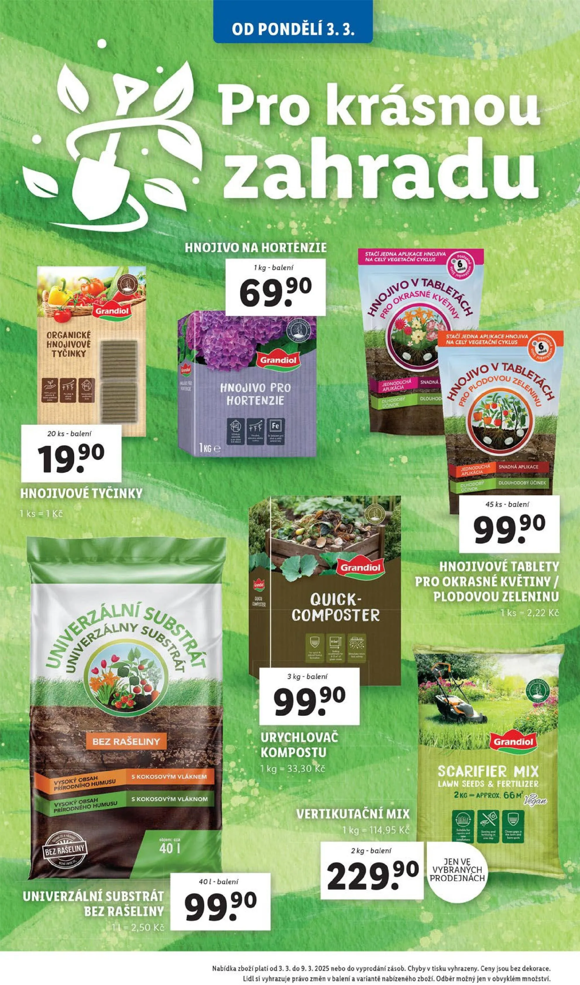 Od pondělí 3.3. si můžete v obchodě Lidl pořídit širokou nabídku produktů pro vaši zahrádku. V letáku najdete organické hnojivové tyčinky Grandiol v balení po 20 ks za 19,90 Kč. Dále hnojivo na hortenzie Grandiol v 1 kg balení za 69,90 Kč, které stačí aplikovat pouze jednou na celý vegetační cyklus.