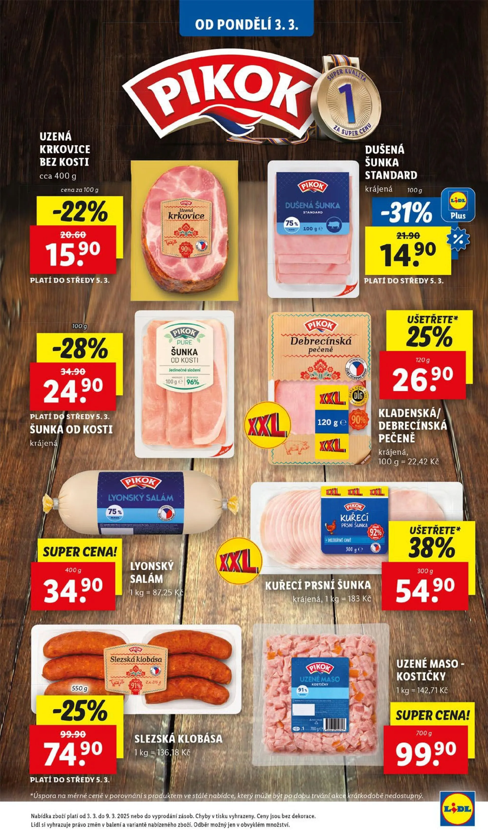 V letáku obchodu Lidl najdete skvělé akční nabídky na uzeniny a šunky. Například uzená krkovice bez kosti o hmotnosti cca 400 g je nyní za zvýhodněnou cenu -22%. Dále je v nabídce debrecínská šunka, pečená a krájená, která je také za výhodnou cenu. Nezapomeňte na kuřecí prsní šunku a slezskou klobásu, které jsou k dostání v různých baleních. Ušetříte také na uzeném mase v kostičkách, které je nyní za super cenu. Akce platí od 3. do 9. března 2025 nebo do vyprodání zásob. Nepropásněte tyto skvělé nabídky!
