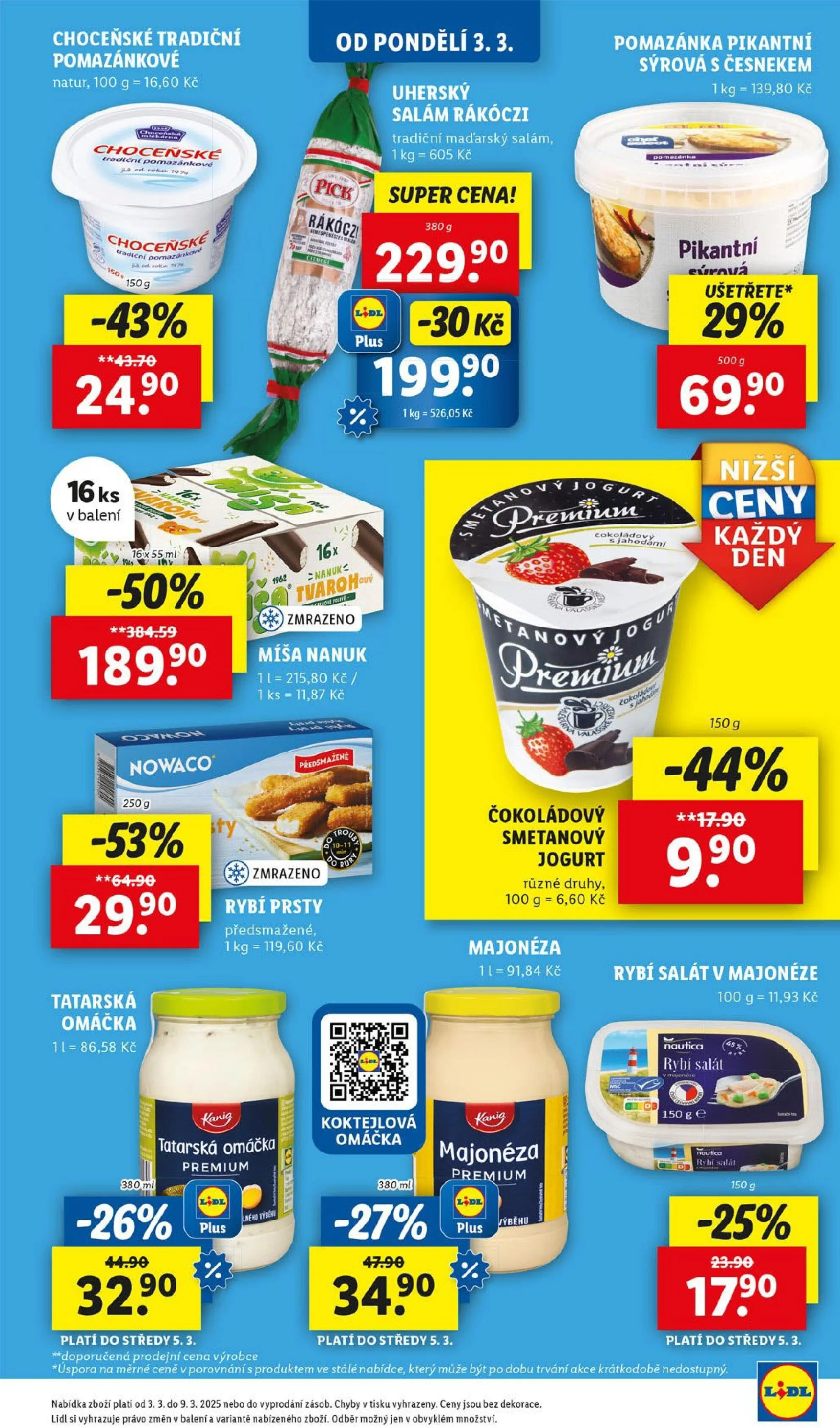 Pro milovníky sýrových pomazánek je tu pikantní sýrová pomazánka s česnekem za 139,80 Kč za kilogram. Nezapomeňte také na zmrazené rybí prsty, které jsou předsmažené a stojí 119,60 Kč za kilogram.