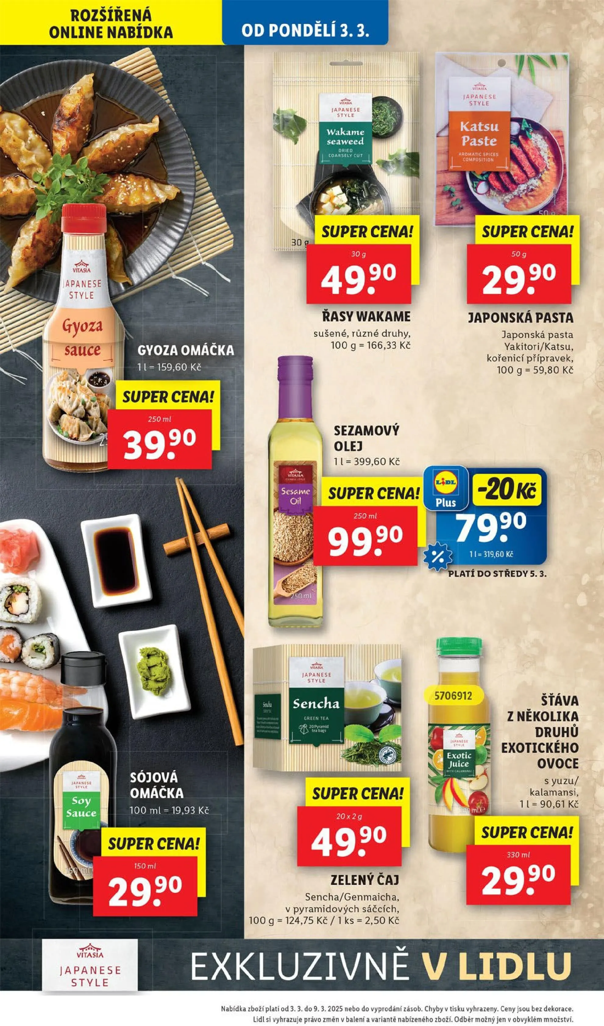 V letáku obchodu Lidl najdete rozšířenou online nabídku japonských produktů, které potěší každého milovníka asijské kuchyně. Od pondělí 3.3. si můžete zakoupit japonskou gyoza omáčku, sušené řasy wakame, sezamový olej a japonské pasty jako yakitori a katsu. V nabídce je také sójová omáčka a zelený čaj sencha v pyramidových sáčcích. Nezapomeňte ochutnat exotickou šťávu z několika druhů ovoce s yuzu a kalamansi. Tyto skvělé produkty jsou k dispozici za super ceny a nabídka platí do 9.3.2025 nebo do vyprodání zásob.