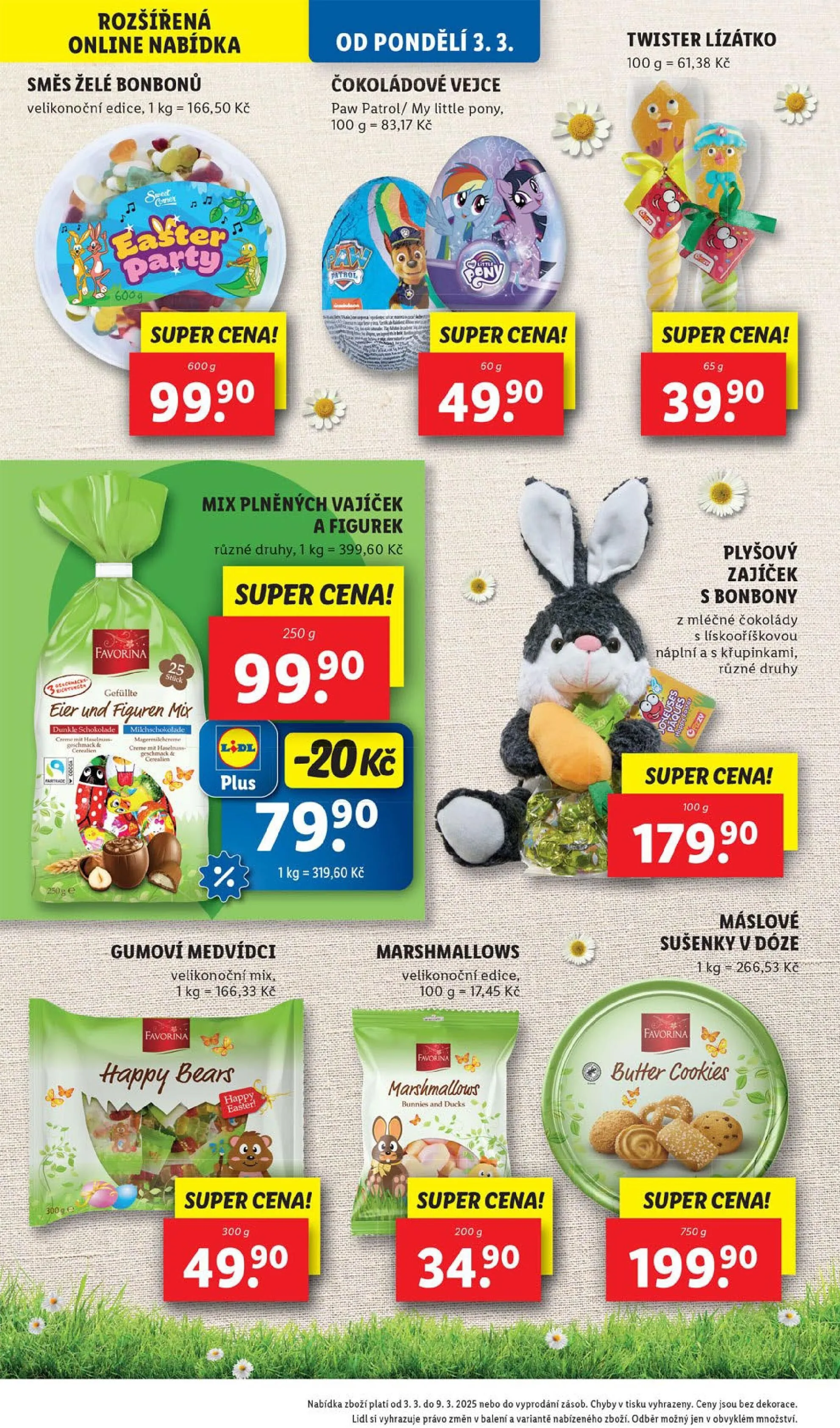 V letáku obchodu Lidl najdete skvělou nabídku velikonočních produktů! Od pondělí 3. března si můžete pořídit smés želé bonbonů v kilogramovém balení za 166,50 Kč. Dále jsou v nabídce čokoládová vejce s motivy Paw Patrol a My Little Pony za 83,17 Kč za 100 g. Nezapomeňte také na mix plněných vajíček a figurek za 1,60 Kč.