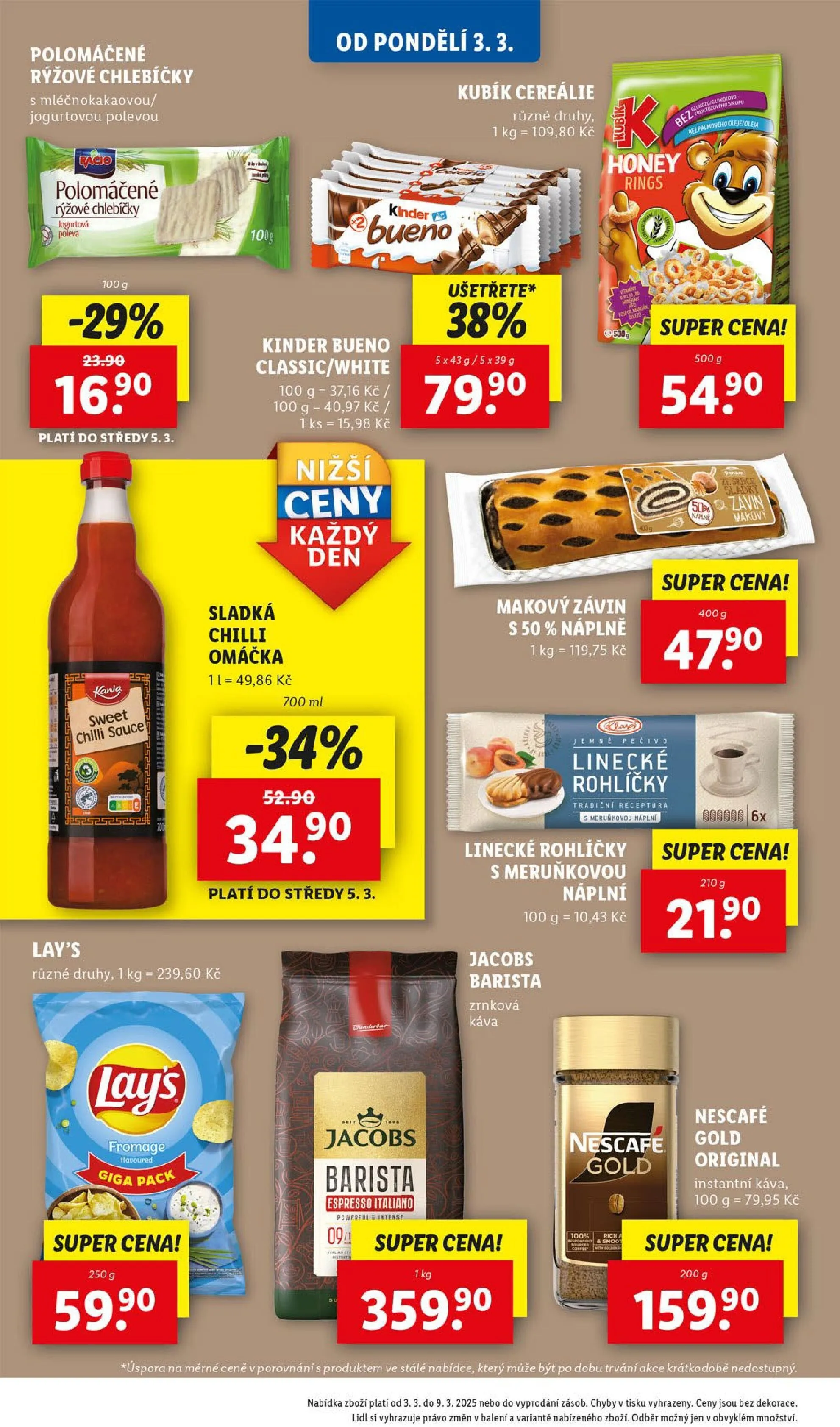 Pro milovníky sladkostí je tu Kinder Bueno v klasické a bílé variantě, a také sladká chilli omáčka v 700 ml balení. Nezapomeňte na makový závin s 50 % náplně, který je nyní za super cenu.
