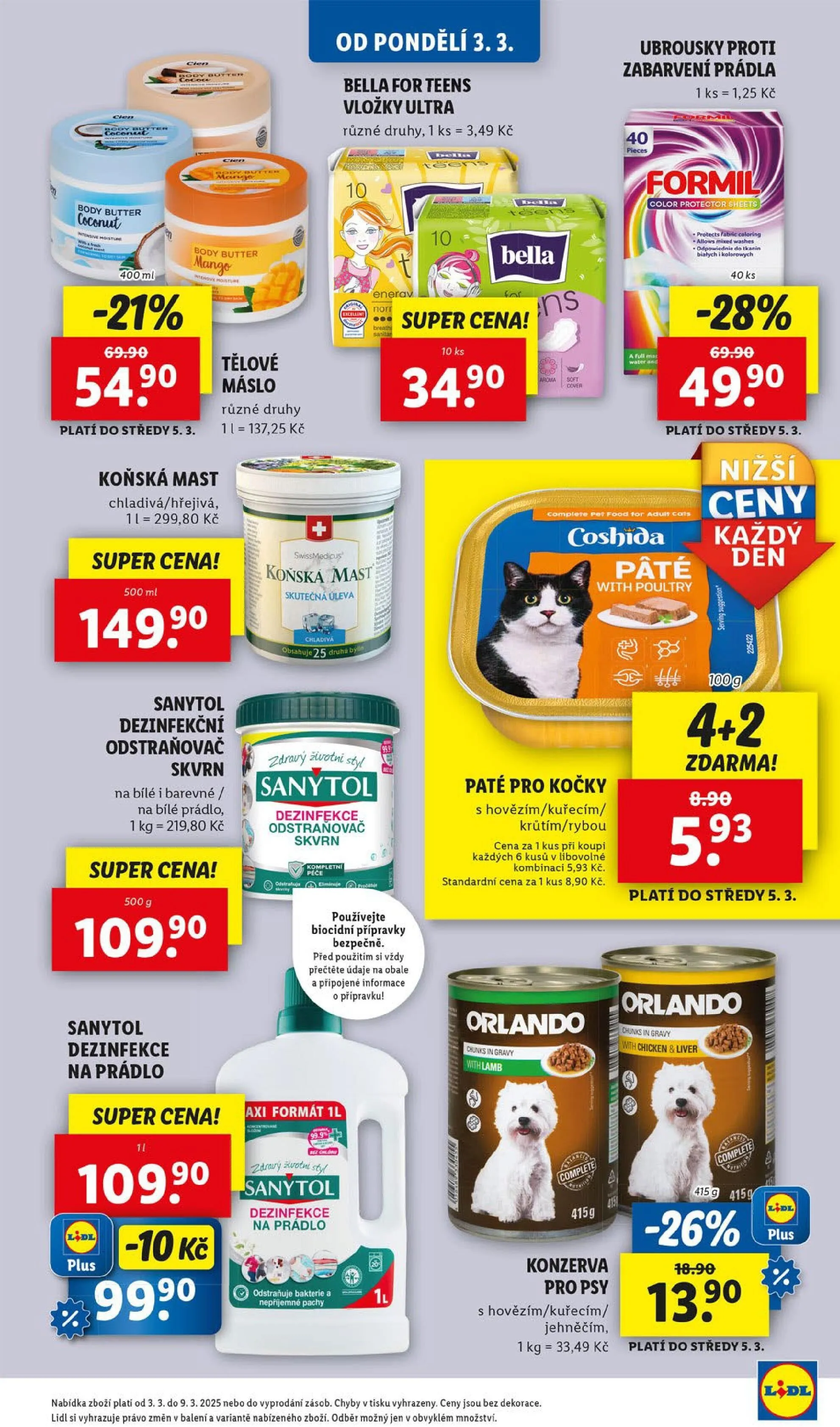 V letáku obchodu Lidl najdete širokou nabídku produktů, které potěší každého zákazníka. Od pondělí 3. března si můžete zakoupit tělové máslo v různých druzích za skvělou cenu 137,25 Kč. Dále nabízíme koňskou mast, která přináší skutečnou úlevu, a to za 149 Kč.