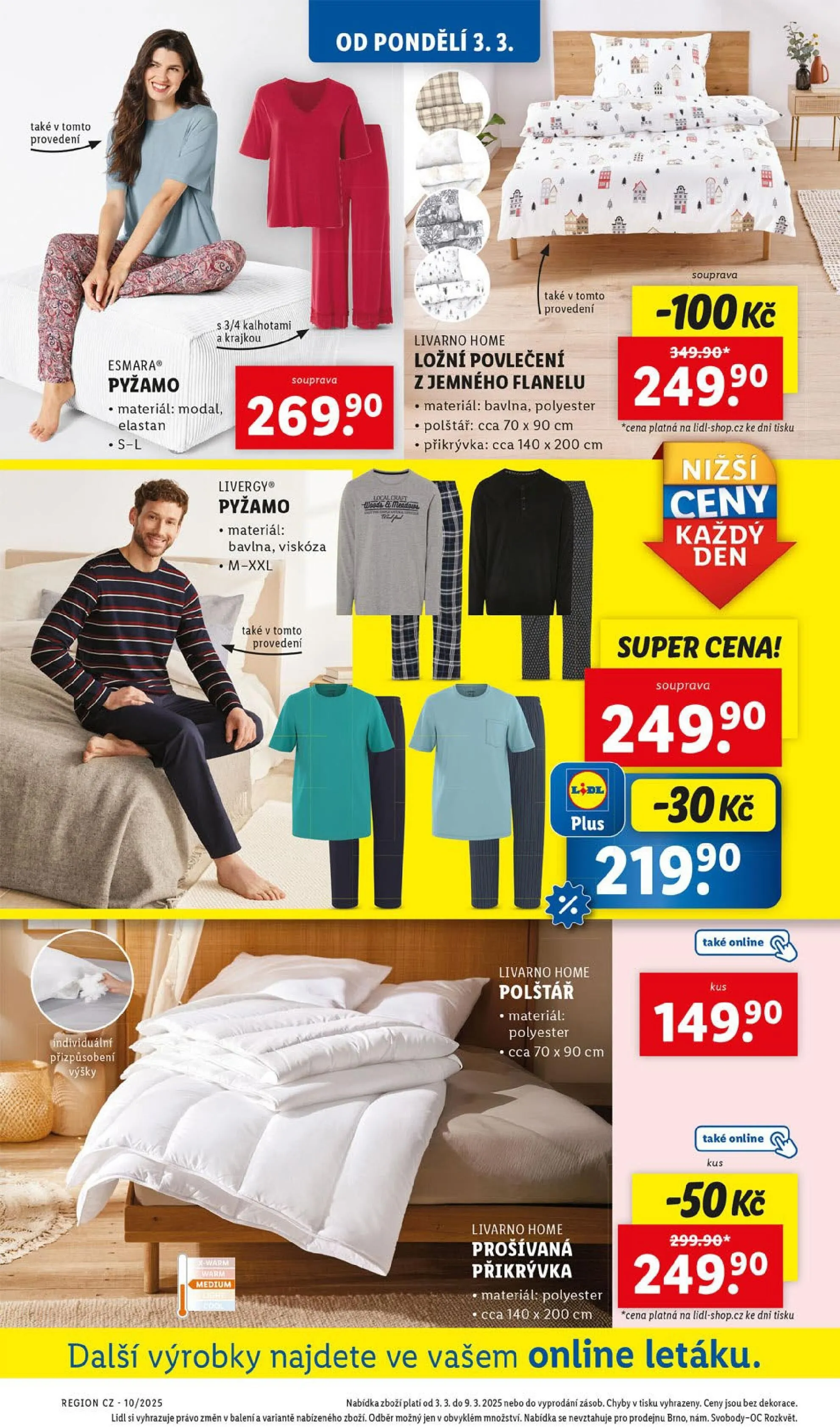 Od pondělí 3. března v obchodech Lidl najdete skvělé nabídky! Mezi nimi se objevuje pyžamo značky esmara, které je vyrobeno z příjemného materiálu modal a elastan. K dispozici je také souprava ložního povlečení od livarno home, vyrobená z jemného flanelu, která zahrnuje polštář o rozměrech cca 70 x 90 cm a přikrývku cca 140 x 200 cm.