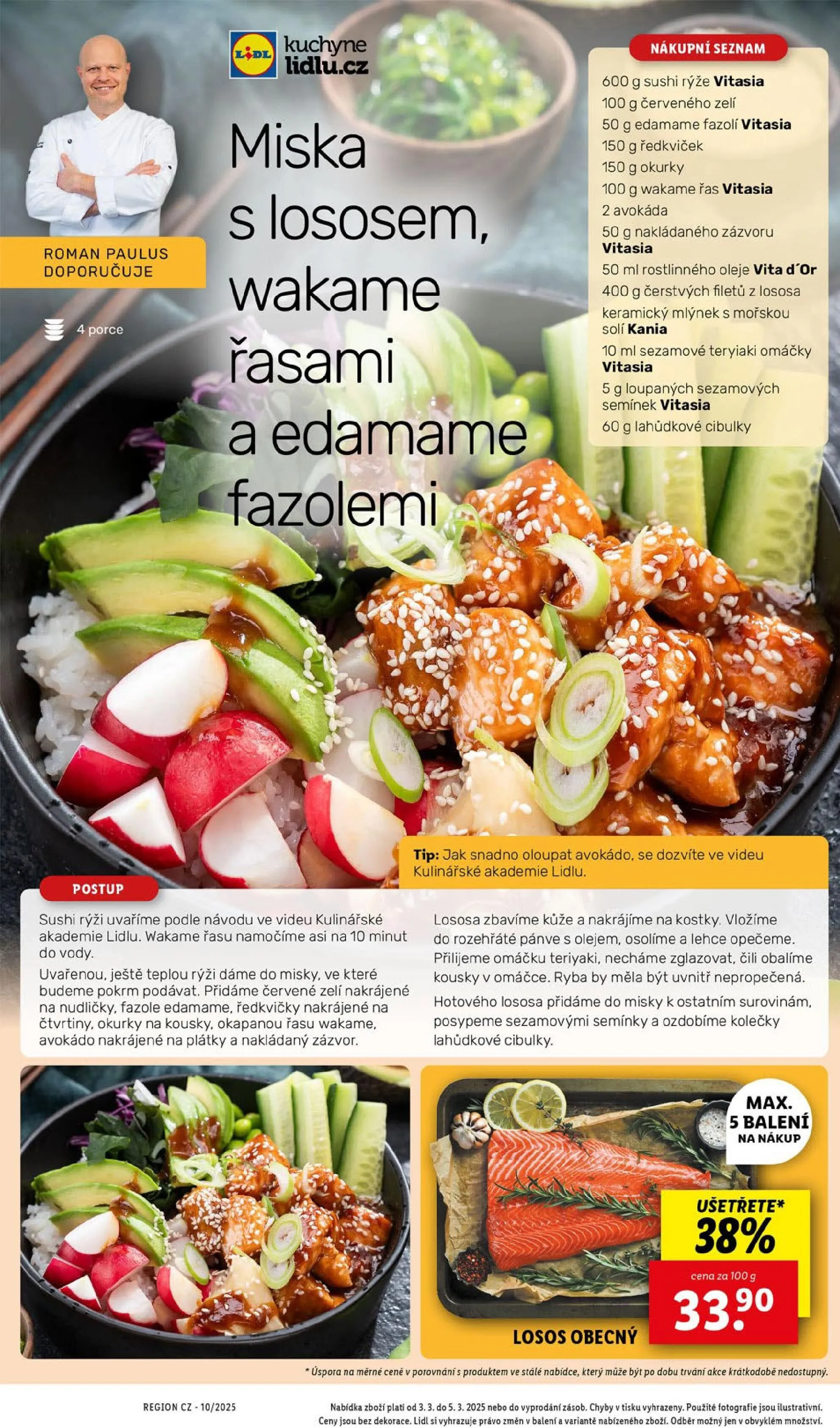 V letáku obchodu Lidl najdete skvělou nabídku na přípravu lahodného sushi s lososem. Doporučujeme vyzkoušet misku s lososem, wakame řasami a edamame fazolemi. Na nákupní seznam si přidejte sushi rýži Vitasia, červené zelí, ředkvičky, okurku, avokáda, nakládaný zázvor a další ingredience.