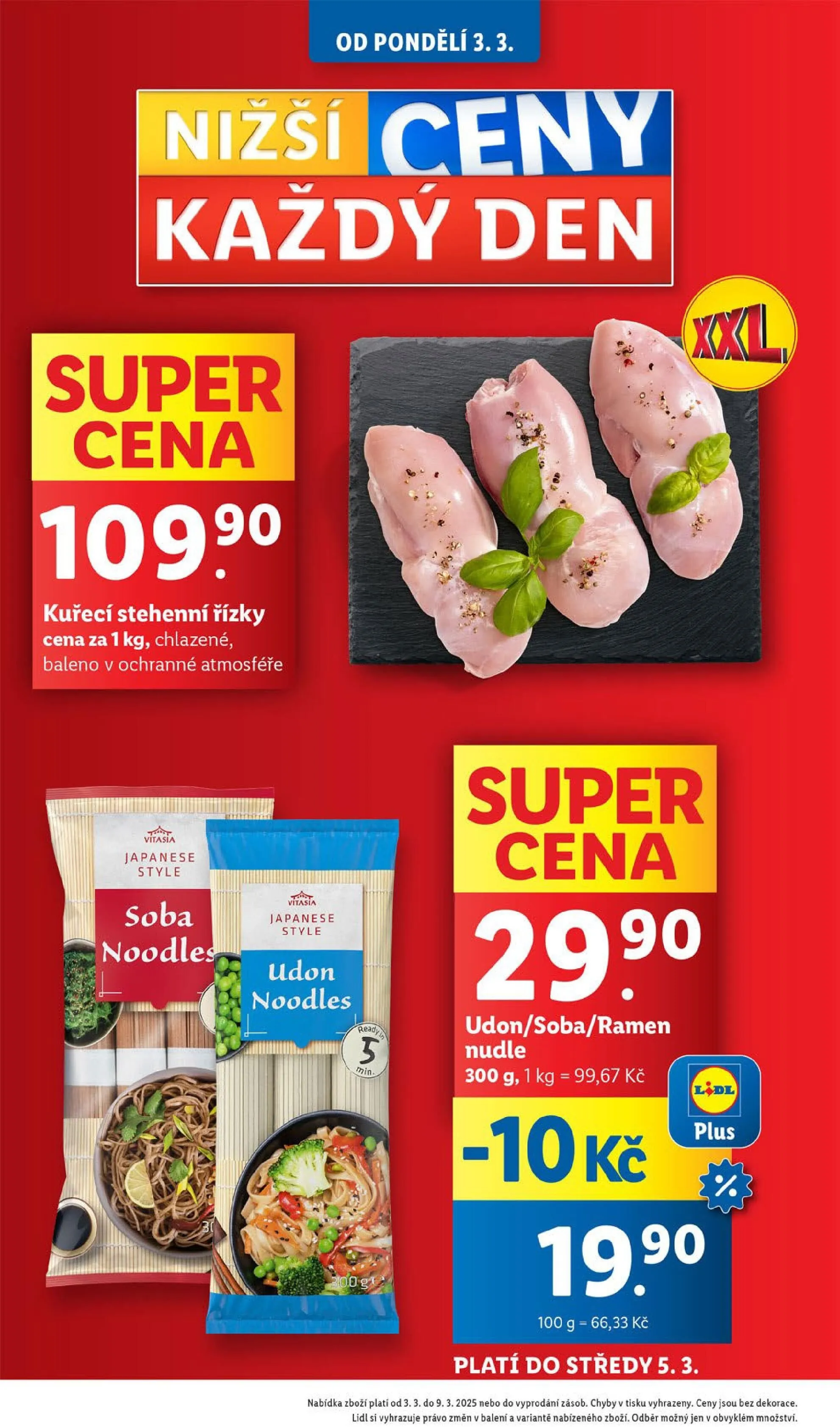 Od pondělí 3. března v Lidlu najdete skvělé nabídky! Mezi nimi jsou kuřecí stehenní řízky za super cenu, balené v ochranné atmosféře. Dále si můžete vychutnat japonské nudle – udon, soba a ramen, které jsou k dispozici v balení 300 g. Cena za 1 kg je 99,67 Kč, což je skvělá příležitost pro milovníky asijské kuchyně. Tato nabídka platí do středy 5. března, nebo do vyprodání zásob. Nezapomeňte, že ceny jsou bez dekorace a Lidl si vyhrazuje právo na změnu balení a variant nabízeného zboží. Těšíme se na vaši návštěvu!