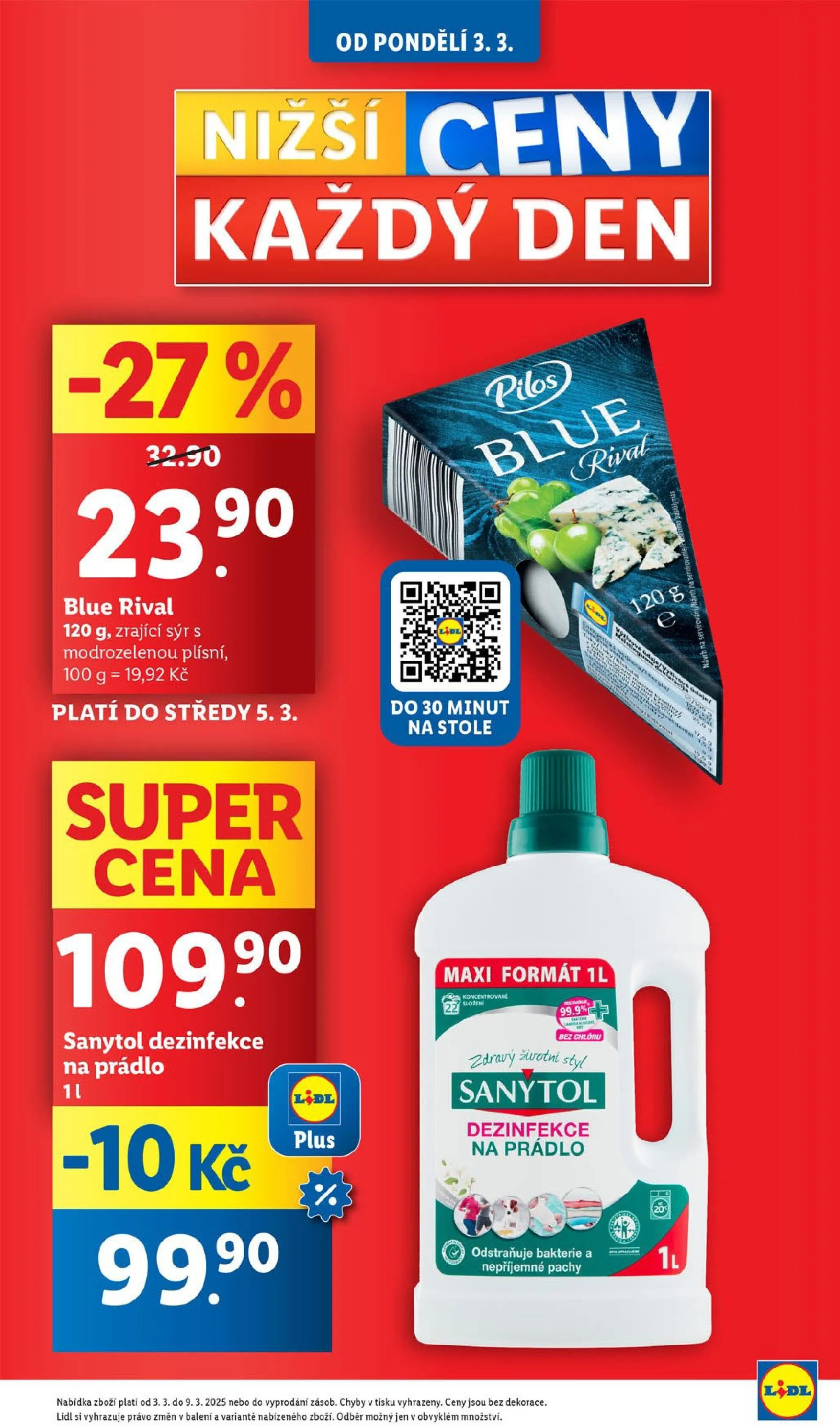 Od pondělí 3. března v Lidlu najdete skvělé nabídky! Zrající sýr s modrozelenou plísní Blue Rival (120 g) je nyní za super cenu 23 Kč, což představuje slevu 27%. Navíc si můžete pořídit dezinfekci na prádlo Sanytol, která účinně odstraňuje bakterie a nepříjemné pachy, za cenu 99,90 Kč, s 10 Kč slevou. Tato nabídka platí do středy 5. března, nebo do vyprodání zásob. Nezapomeňte, že ceny jsou bez dekorace a Lidl si vyhrazuje právo na změny v balení a variantách zboží.