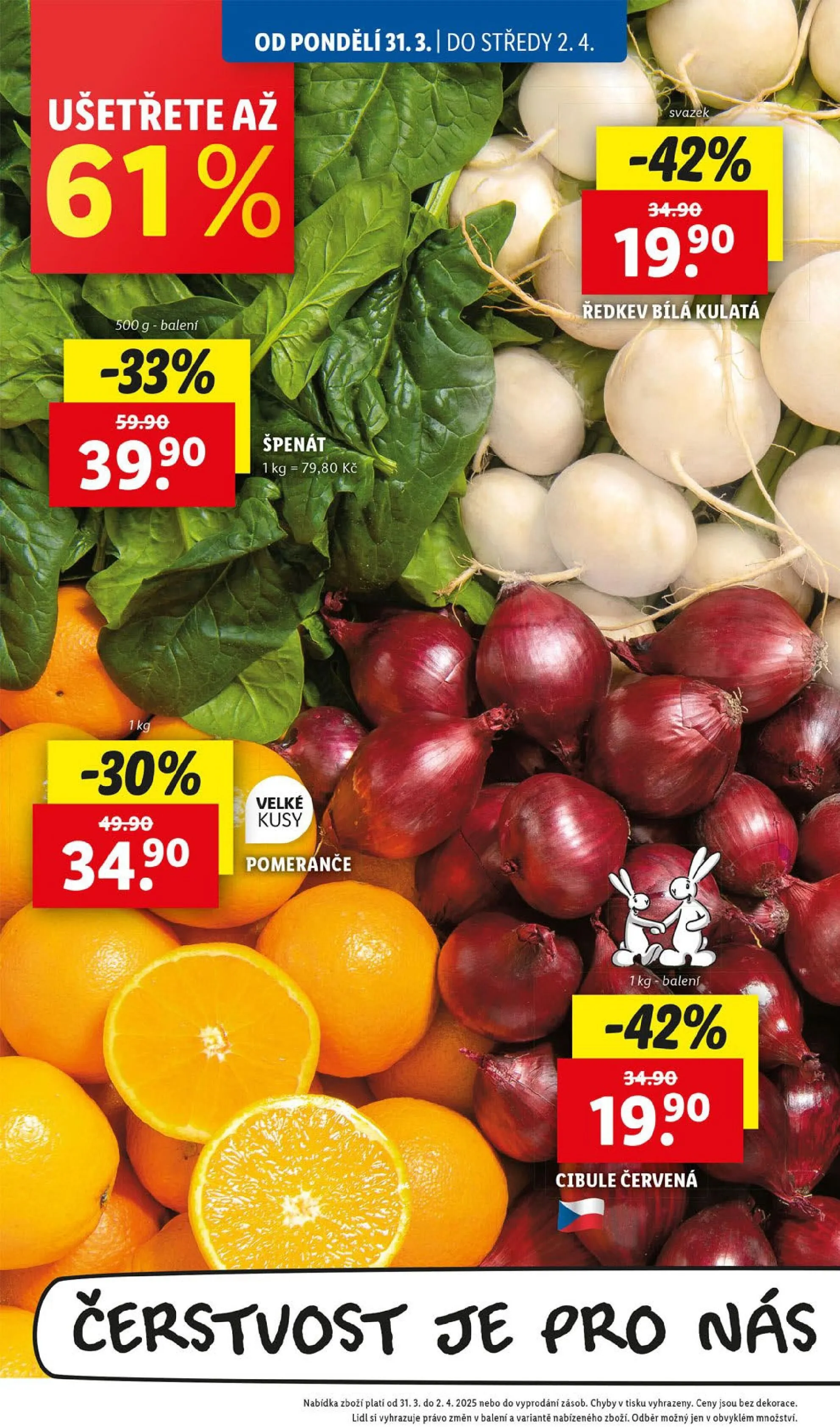 Od pondělí 31. března do středy 2. dubna máte možnost ušetřit na vybraných produktech v obchodě Lidl. V nabídce najdete špenát za skvělou cenu 79,80 Kč za 1 kg, což představuje úsporu až 33%. Dále nabízíme velké kusy pomerančů a ředkev bílou kulatou se slevou 42%. Nezapomeňte také na červenou cibuli, která je rovněž za výhodnou cenu se slevou 42%. Tato nabídka platí do vyprodání zásob. Těšíme se na vaši návštěvu!