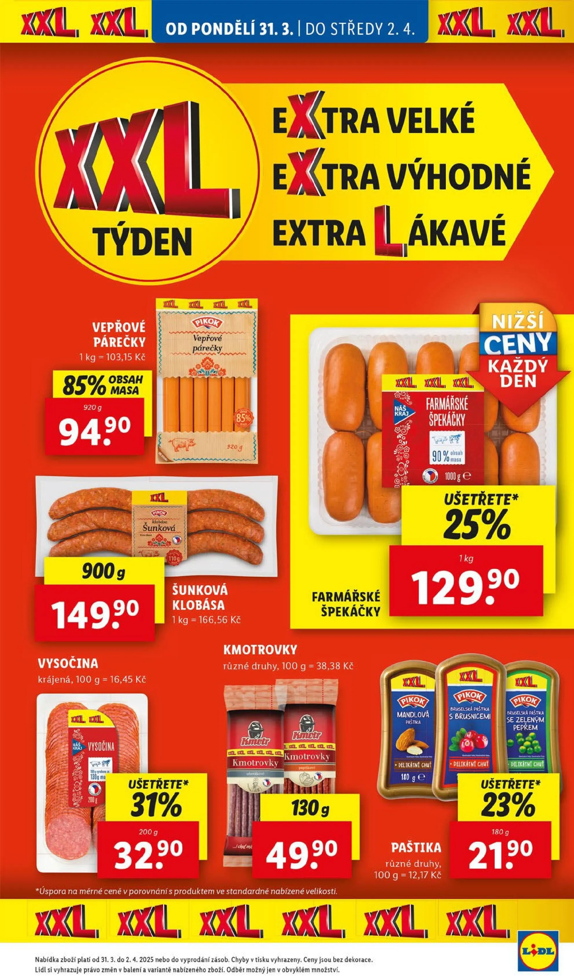 Od pondělí 31. března do středy 2. dubna si nenechte ujít velký výhodný týden v Lidlu! V nabídce najdete vepřové párečky za skvělou cenu 103,15 Kč za 1 kg. Dále nabízíme šunkové vepřové párečky a farmářské špekáčky, které potěší každého milovníka masa.