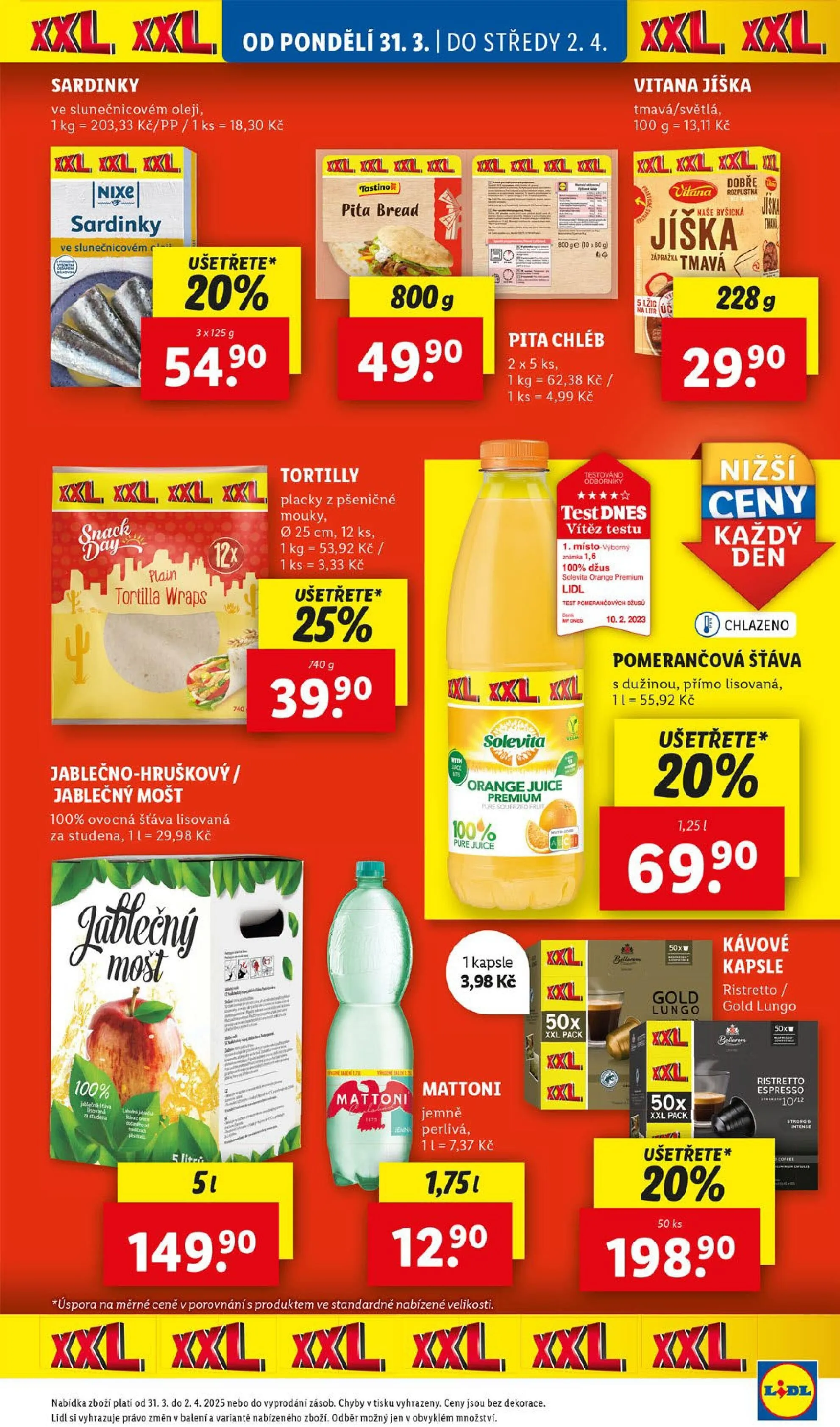 Od pondělí 31.3. do středy 2.4. si v Lidlu můžete vybrat z široké nabídky produktů. Nabízíme sardinky ve slunečnicovém oleji za skvělou cenu 18,30 Kč za 100 g. Dále máme tortilly z pšeničné mouky, balení 12 ks za 3,33 Kč za kus. Nezapomeňte také na Vitana jíšku, ať už tmavou nebo světlou, za 13,11 Kč za 100 g.