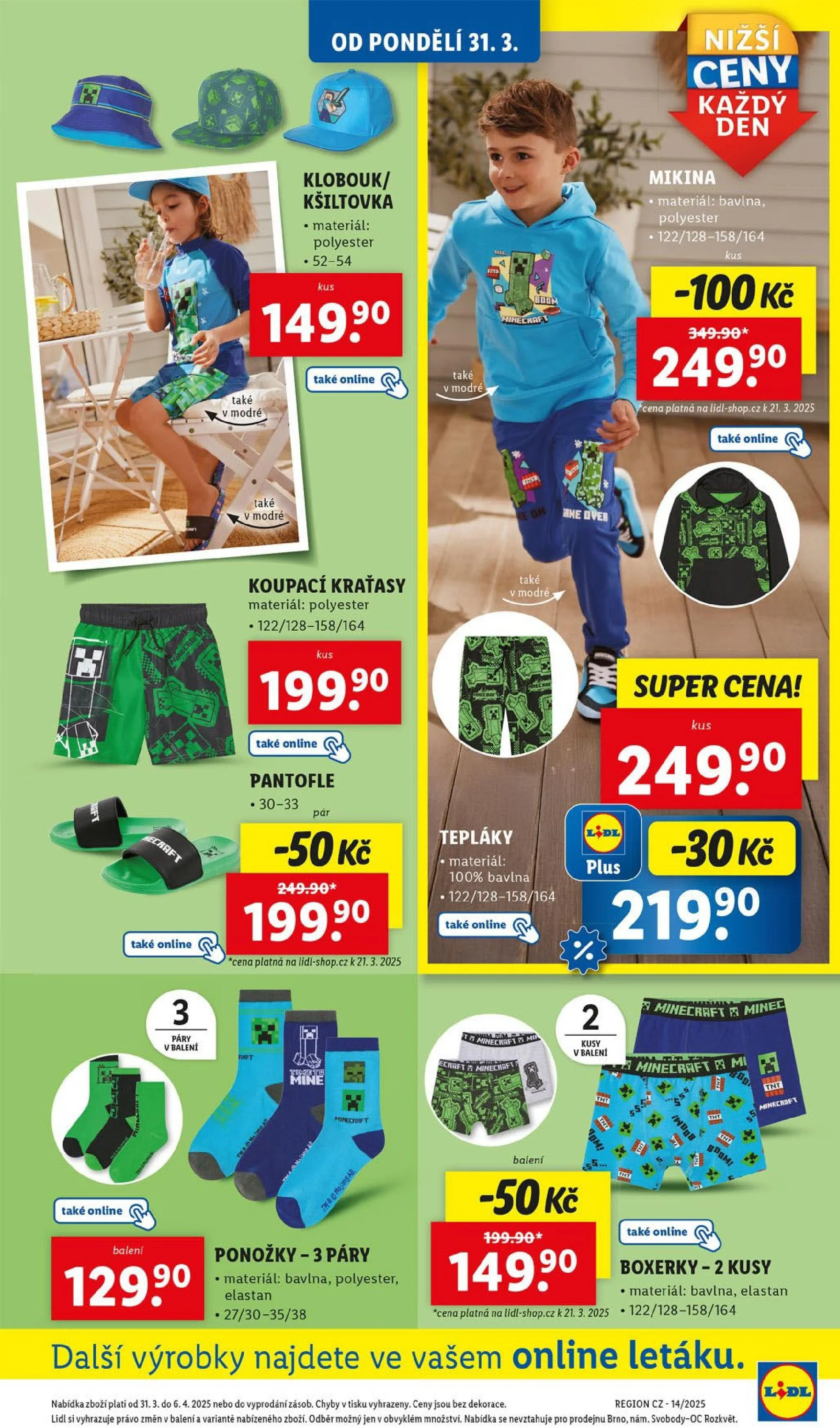 Od pondělí 31.3. v obchodě Lidl najdete širokou nabídku produktů. Mezi nimi jsou klobouky a kšiltovky vyrobené z polyesteru v velikosti 52-54, které jsou k dispozici také online. Dále si můžete pořídit koupací kraťasy v různých velikostech (122/128-158/164) za cenu 199 Kč.
