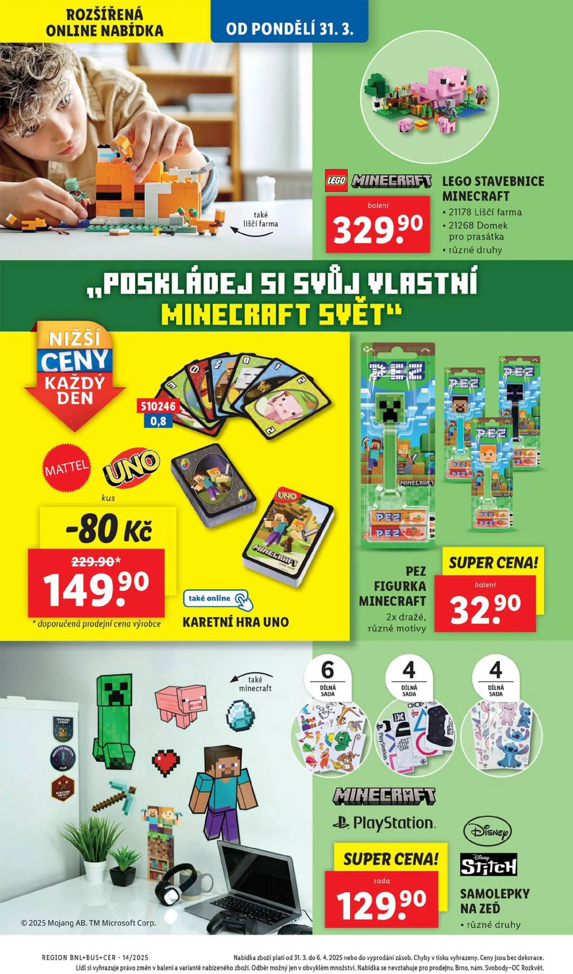V letáku obchodu Lidl najdete rozšířenou online nabídku, která začíná v pondělí 31. března. Mezi zajímavé produkty patří LEGO stavebnice z Minecraftu, jako je 21178 liščí farma a 21268 domek pro prasátka. Dále si můžete pořídit karetní hru UNO a různé figurky Minecraftu. Nabídka zahrnuje také dílnou sadu a samolepky na zeď v různých druzích. Akce platí od 31. března do 6. dubna 2025 nebo do vyprodání zásob. Nezapomeňte, že ceny jsou bez dekorace a Lidl si vyhrazuje právo na změny v balení a variantách zboží.