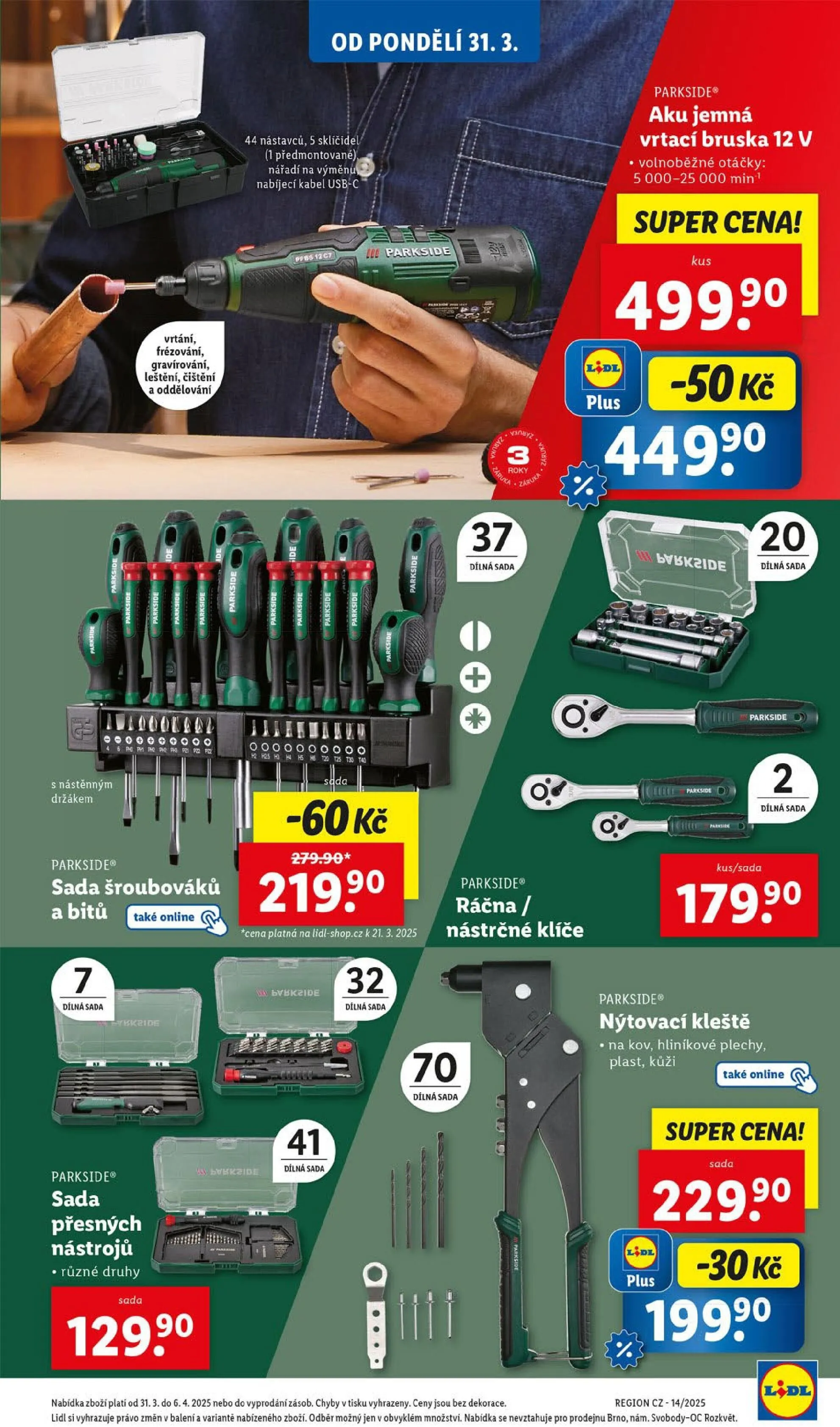 V letáku obchodu Lidl najdete širokou nabídku produktů značky Parkside, které jsou ideální pro vaši dílnu. Mezi nimi se nachází aku jemná vrtací bruska s volnoběžnými otáčkami od 5 000 do 25 000 min, která je nyní za super cenu 499 Kč. Dále nabízíme sadu šroubováků a bitů, dílnou sadu s 44 nástavci a 5 sklíčidly, a také nýtovací kleště vhodné na kov, hliníkové plechy, plast a kůži. Nezapomeňte, že všechny produkty jsou dostupné také online. Akce platí od 31. března do 6. dubna 2025 nebo do vyprodání zásob.