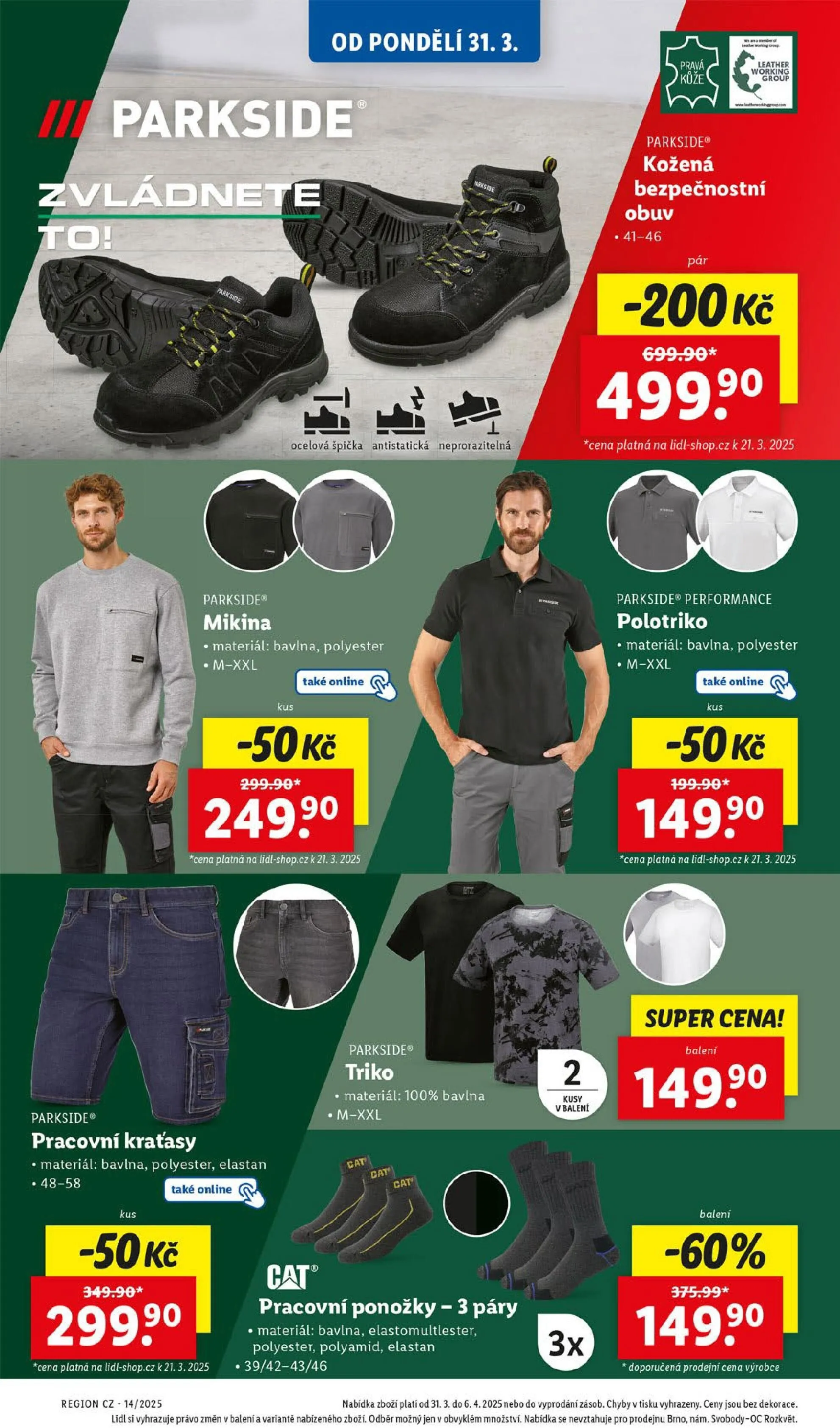 Od pondělí 31. března v obchodech Lidl najdete skvělou nabídku produktů značky Parkside. Mezi nimi se objevují antistatické neprorazitelné bezpečnostní boty, které jsou k dispozici ve velikostech 41-46 za cenu 499 Kč po slevě 200 Kč. Dále si můžete pořídit pracovní kraťasy z bavlny, polyesteru a elastanu ve velikostech 48-58 za 299 Kč, což je sleva 50 Kč.