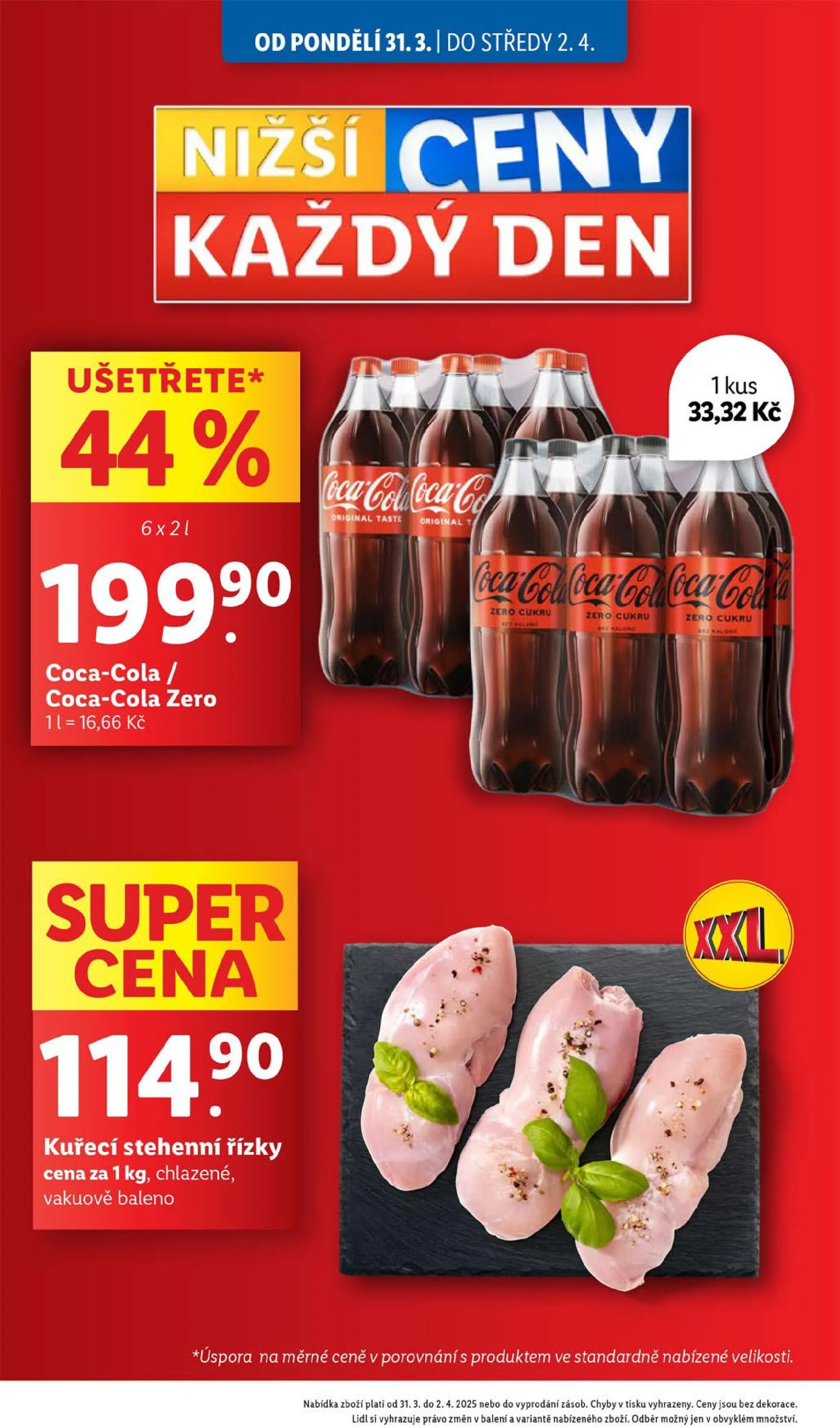 Od pondělí 31. března do středy 2. dubna máte možnost využít skvělé nabídky v obchodě Lidl. Ušetřete na vybraných produktech, jako jsou kuřecí stehenní řízky za cenu 33,32 Kč za 1 kg, chlazené a vakuově balené. Dále si můžete zakoupit Coca-Colu nebo Coca-Colu Zero za super cenu. Tato nabídka platí do vyprodání zásob, tak neváhejte a přijďte si pro své oblíbené produkty!