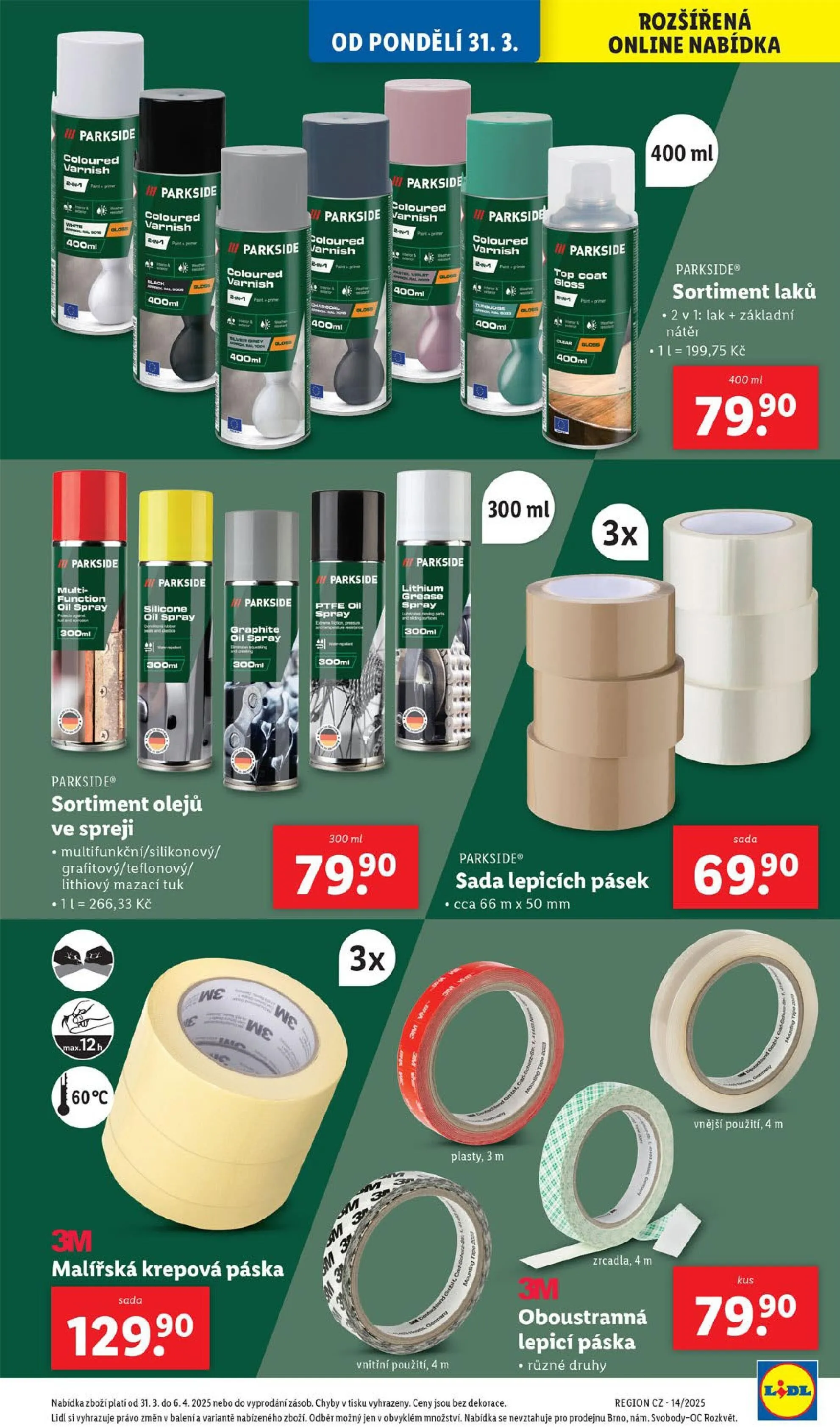 Od pondělí 31. března v obchodě Lidl najdete širokou nabídku produktů značky Parkside. Mezi novinkami jsou laky a laky ve spreji, které jsou ideální pro vnitřní i vnější použití. V nabídce je také multifunkční mazací tuk, malířská krepová páska a sada lepicích pásek různých druhů. Všechny produkty jsou k dispozici za výhodné ceny, například lak 2 v 1 za 79 Kč nebo sada lepicích pásek za 69 Kč. Nezapomeňte, že nabídka platí do 6. dubna 2025 nebo do vyprodání zásob. Ceny jsou uvedeny bez dekorace.