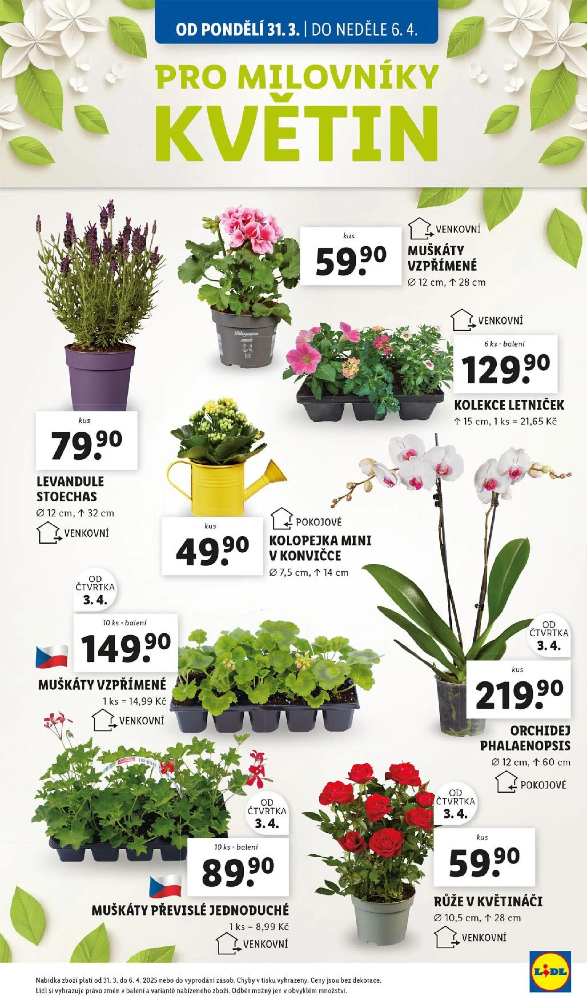 Od pondělí 31. března do neděle 6. dubna nabízí Lidl široký výběr rostlin a květin. V nabídce najdete muškáty vzpřímené za 14,99 Kč za kus, levanduli stoechas v různých velikostech, a také muškáty převislé jednoduché v balení po 10 kusech za 89 Kč. Pro milovníky pokojových rostlin je k dispozici kolopejka mini v konvičce za 49 Kč. Dále si můžete pořídit orchidej phalaenopsis za 59 Kč a růže v květináči za 21,65 Kč. Nabídka platí do vyprodání zásob. Nezapomeňte, že ceny jsou bez dekorace a Lidl si vyhrazuje právo na změny v balení a variantách nabízeného zboží.