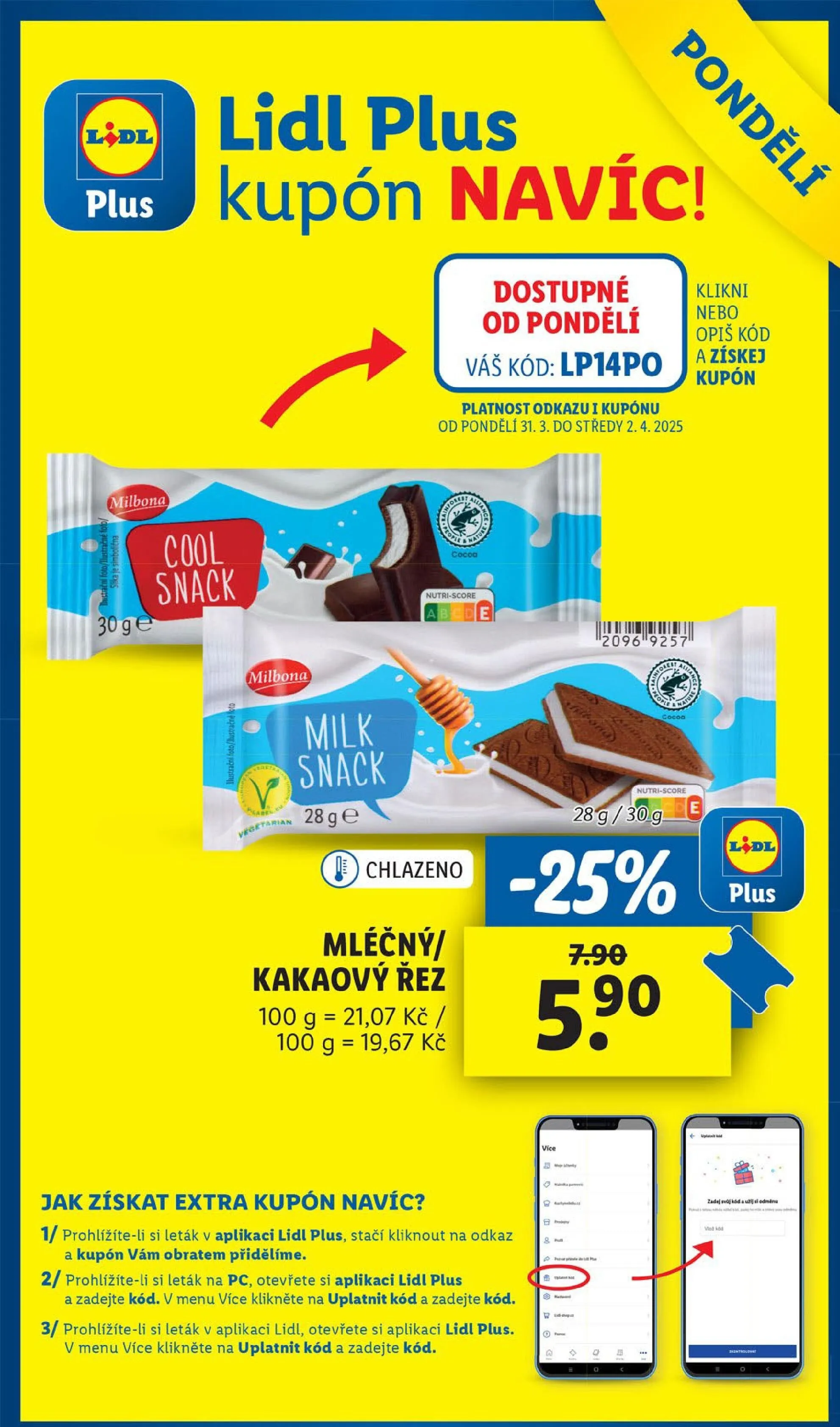 V letáku obchodu Lidl najdete skvělé nabídky a produkty, které si nesmíte nechat ujít! Mezi nimi je například mléčný a kakaový řez Milbona, který je k dispozici v balení 30 g a 28 g. Tento lahodný snack si můžete pořídit od pondělí. Navíc, pokud využijete speciální kód lp14po, získáte extra kupón navíc! Platnost kupónu je od 31. března do 2. dubna 2025. Nezapomeňte, že pro získání kupónu stačí kliknout na odkaz v aplikaci Lidl Plus nebo zadat kód v menu. Využijte tuto skvělou příležitost a užijte si výhodné nákupy!