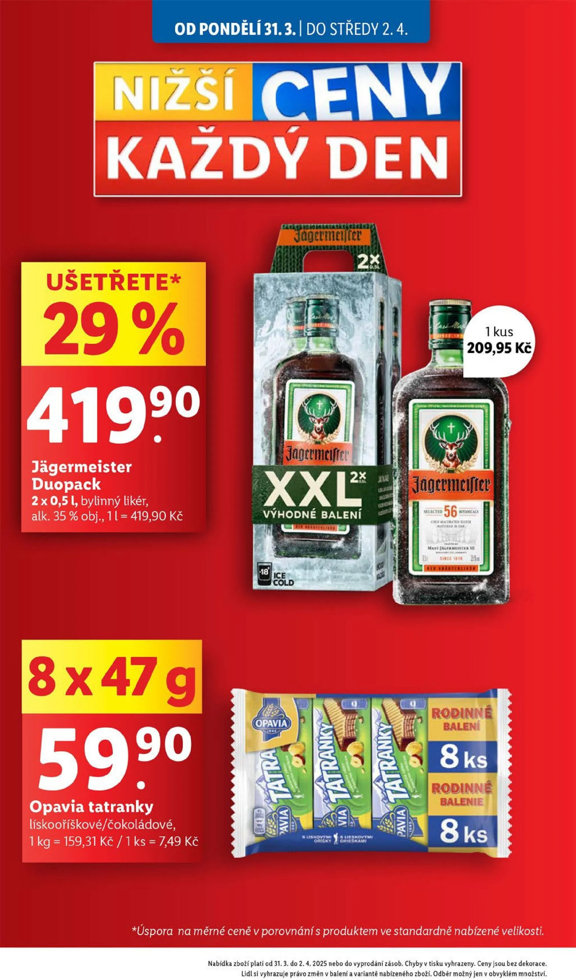 Od pondělí 31. března do středy 2. dubna si můžete v Lidlu pořídit skvělé produkty za výhodné ceny! V nabídce najdete duopack bylinného likéru Jägermeister (2 x 0,5 l) za 419 Kč. Dále si můžete vychutnat Opavia Tatranky v lískooříškové nebo čokoládové variantě, které jsou k dostání v balení po 8 ks za 599 Kč. Nezapomeňte, že nabídka platí do vyprodání zásob. Ušetřete s námi!