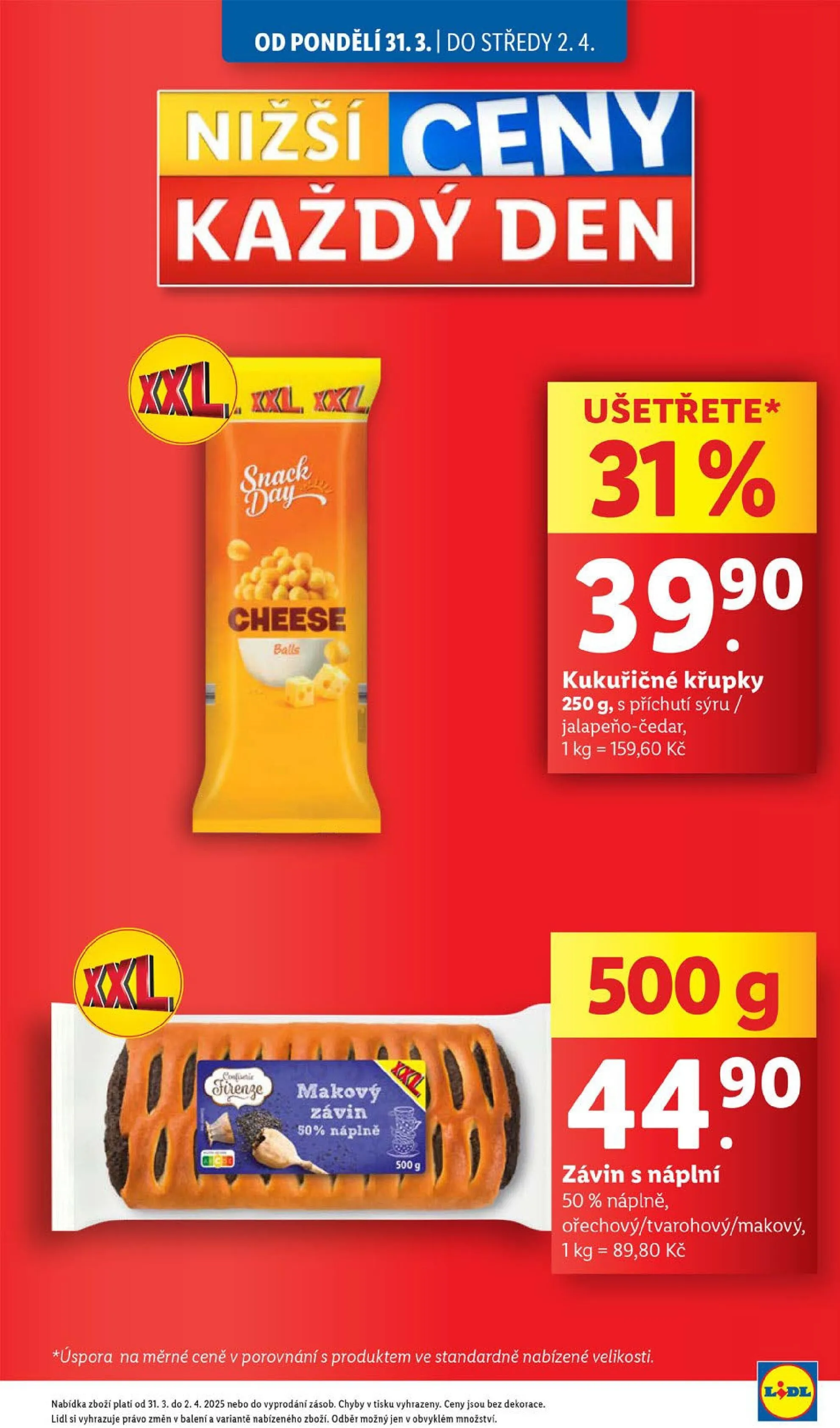 Od pondělí 31. března do středy 2. dubna si nenechte ujít skvělé nabídky v obchodě Lidl! Každý den můžete zakoupit makový závin s 50% náplní za skvělou cenu. Dále nabízíme kukuřičné křupky s příchutí sýru nebo jalapeňo-čedar v balení 250 g. A nezapomeňte na náš ořechový, tvarohový nebo makový závin s 50% náplní, který je také k dispozici. Ušetřete s námi a využijte tuto jedinečnou nabídku, která platí do vyprodání zásob!