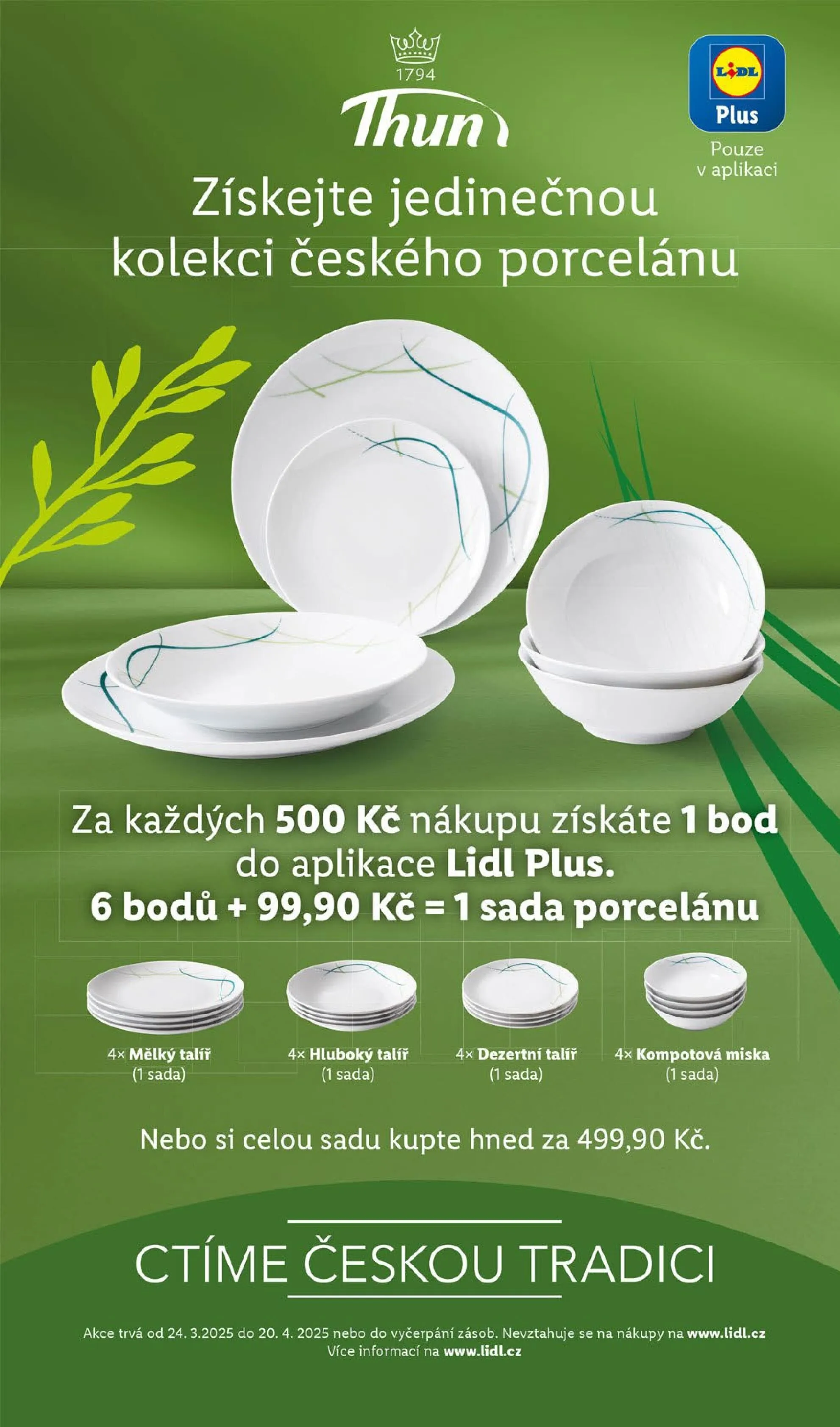 V letáku obchodu Lidl najdete jedinečnou kolekci českého porcelánu. Získejte body do aplikace Lidl Plus – za každých 500 Kč nákupu obdržíte 1 bod. Po nasbírání 6 bodů a doplacení 99,90 Kč můžete získat sadu porcelánu, která zahrnuje 4 mělké talíře, 4 hluboké talíře, 1 dezertní talíř a 4 kompotové misky. Celou sadu si můžete také zakoupit hned za 499,90 Kč. Akce platí od 24.3.2025 do 20.4.2025 nebo do vyčerpání zásob. Více informací naleznete na www.lidl.cz. Ctíme českou tradici!