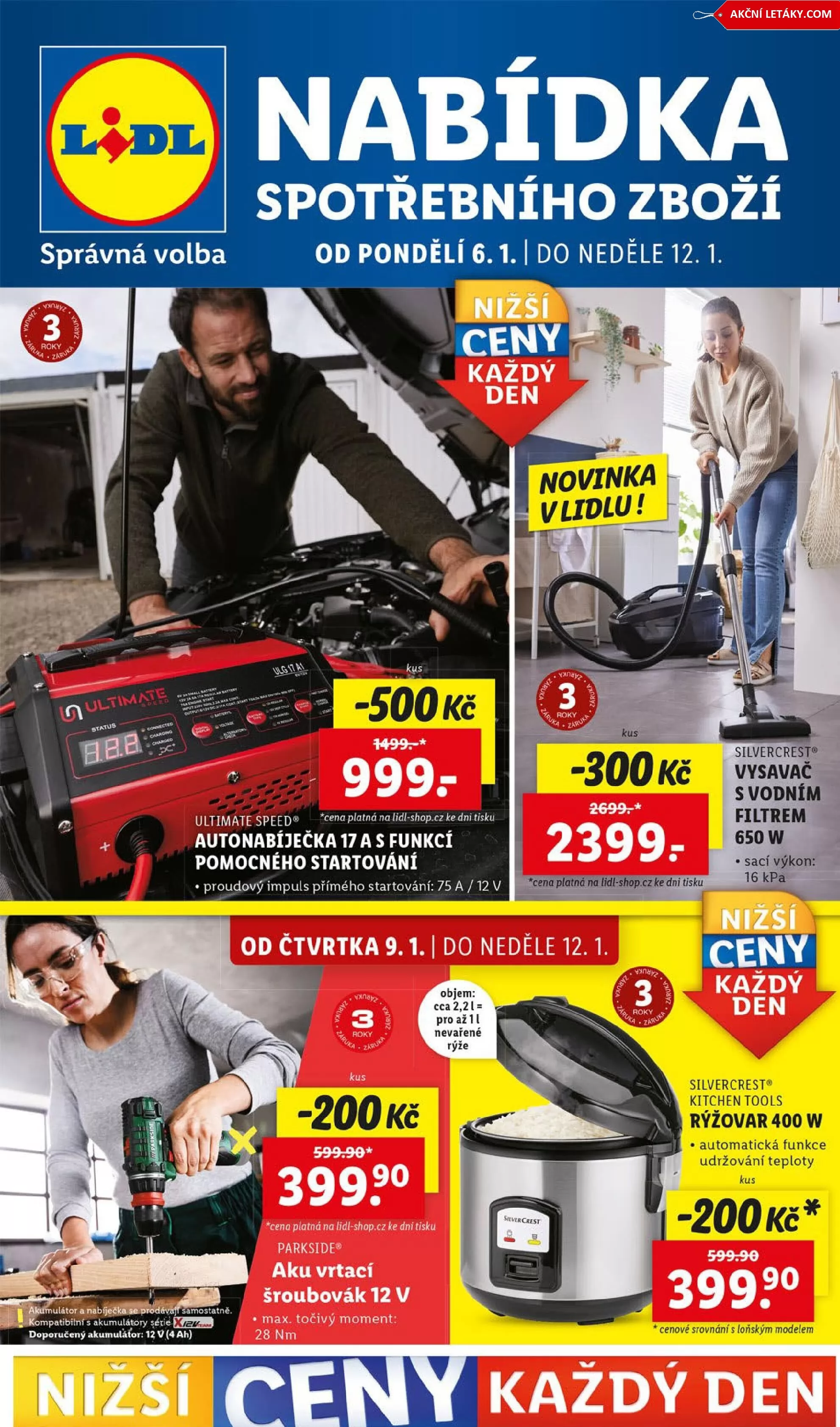 V letáku obchodu Lidl najdete skvělou nabídku produktů, které potěší každého. Od pondělí 6. ledna do neděle 12. ledna si můžete pořídit autonabíječku s funkcí pomocného startování za akční cenu 2399 Kč, což je úspora 500 Kč.