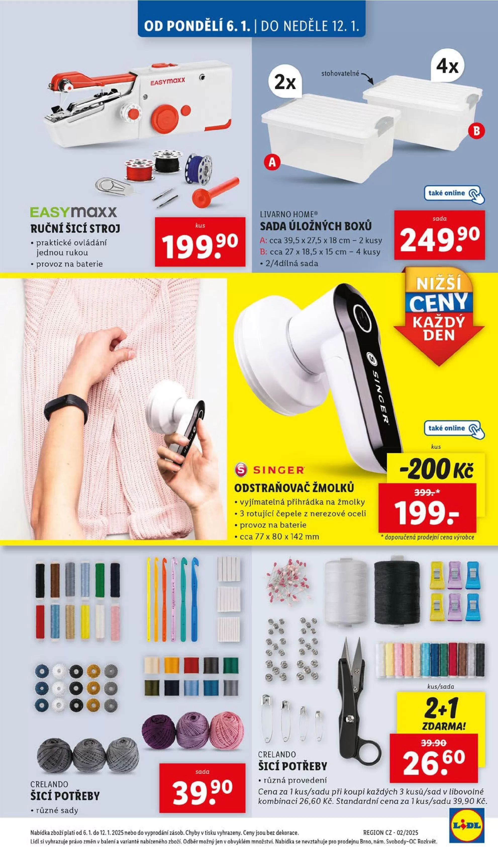 Od pondělí 6.1. do neděle 12.1. si v Lidlu můžete pořídit zajímavé produkty. Mezi nimi je praktický ruční šicí stroj easymaxx, který se ovládá jednou rukou a je na baterie, za cenu 199 Kč. Dále nabízíme sadu úložných boxů Livarno Home, která obsahuje dva větší a čtyři menší boxy, ideální pro organizaci domácnosti.