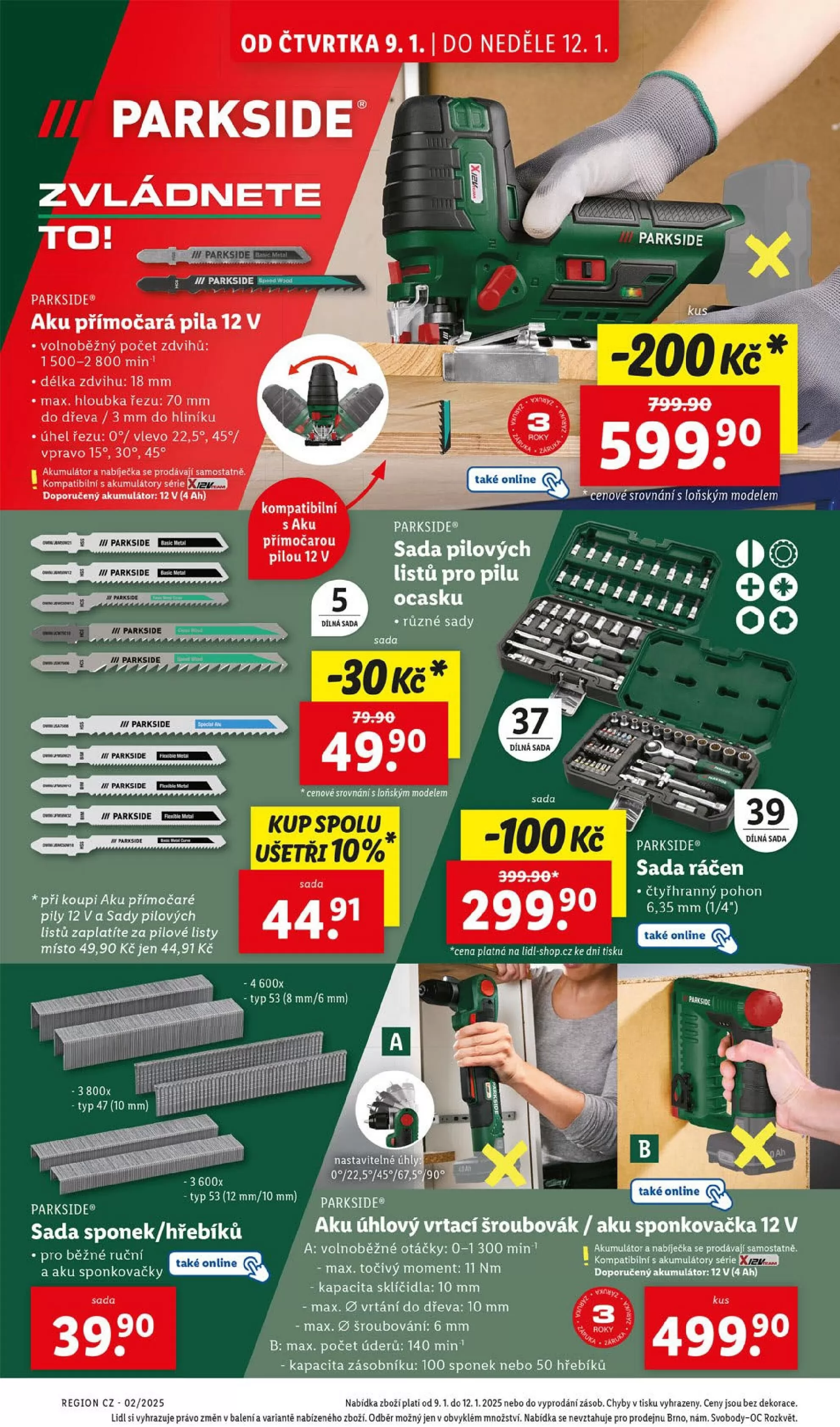Od čtvrtka 9.1. do neděle 12.1. si v Lidlu můžete pořídit skvělé produkty značky Parkside. Mezi nimi najdete aku přímočarou pilu 12 V s volnoběžným počtem zdvihů 1 500-2 800 min a maximální hloubkou řezu 70 mm do dřeva. K tomu nabízíme sadu pilových listů, kterou můžete zakoupit za zvýhodněnou cenu při koupi pily.