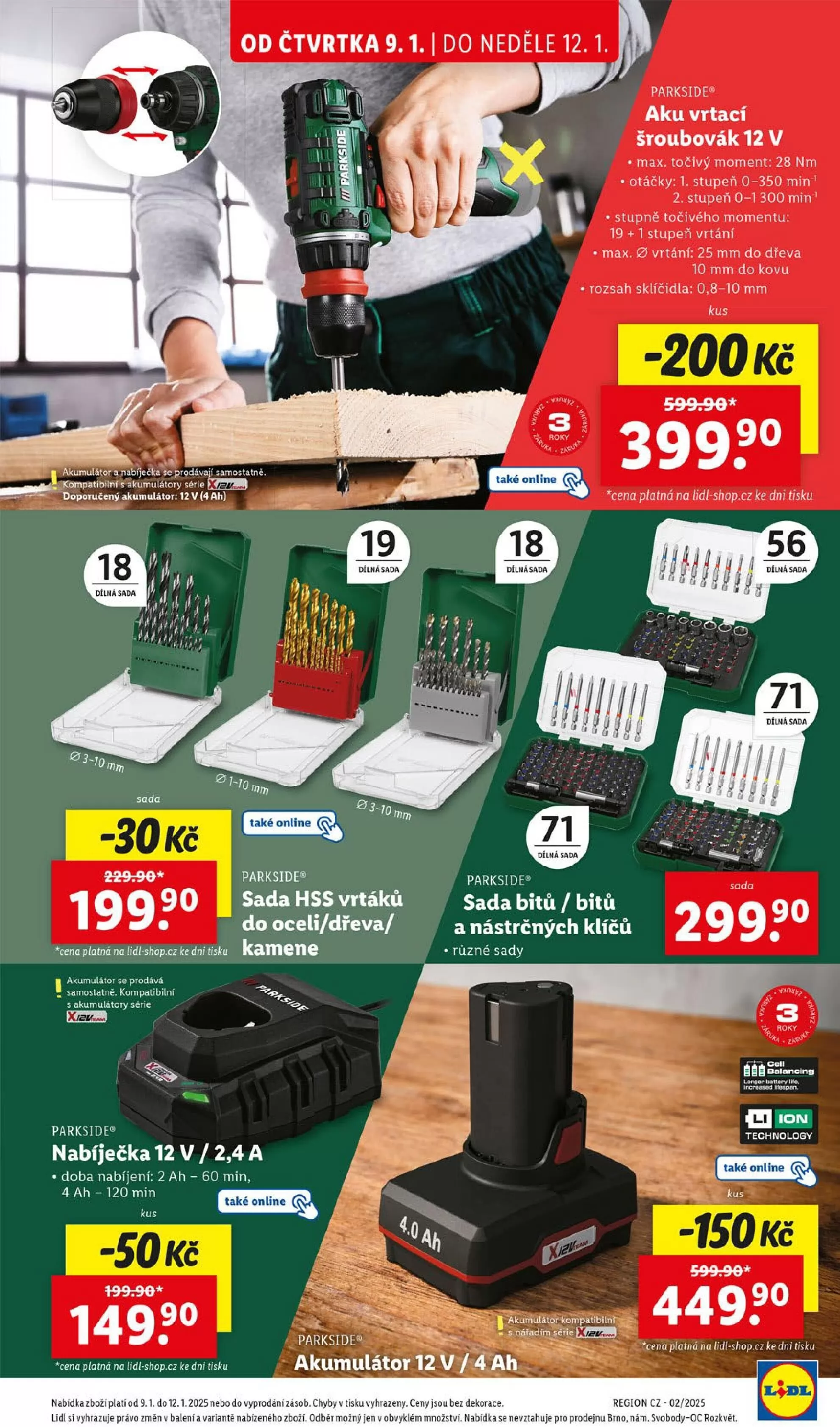 Od čtvrtka 9.1. do neděle 12.1. si v Lidlu můžete pořídit skvělé produkty značky Parkside. Mezi nimi najdete aku vrtací šroubovák 12 V s maximálním točivým momentem 28 Nm a dvěma stupni otáček. Tento šroubovák je ideální pro vrtání do dřeva (max. 25 mm) a kovu (max. 10 mm). Cena je nyní 399 Kč, což je sleva 200 Kč.