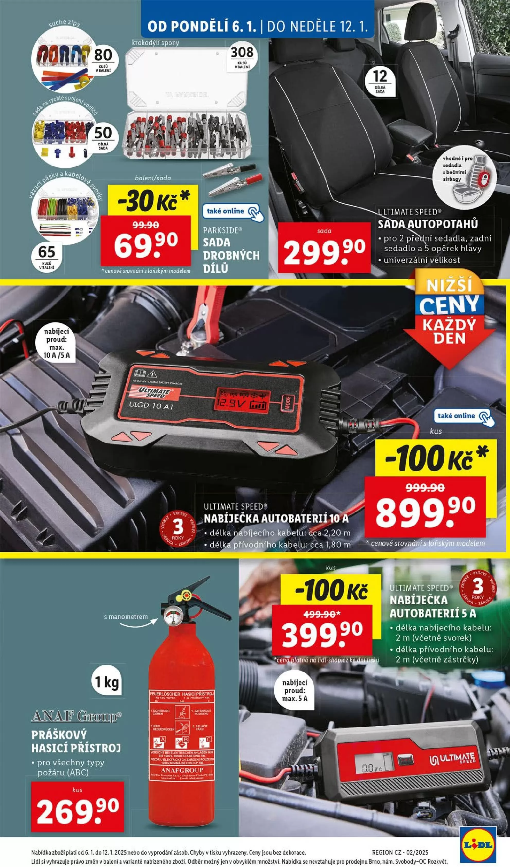 V letáku obchodu Lidl najdete širokou nabídku produktů, které potěší každého zákazníka. Od pondělí 6.1. do neděle 12.1. si můžete pořídit například krokodýlí spony za 89 Kč nebo sadu drobných dílů Ultimate Speed za 299 Kč. Pro bezpečnost vašeho vozidla je k dispozici nabíječka autobaterií s maximálním proudem 10 A za 899 Kč a také model s proudem 5 A za 399 Kč. Nezapomeňte také na práškový hasicí přístroj, který je vhodný pro všechny typy požárů, za cenu 269 Kč. Nabídka platí do vyprodání zásob, tak neváhejte a navštivte nás!