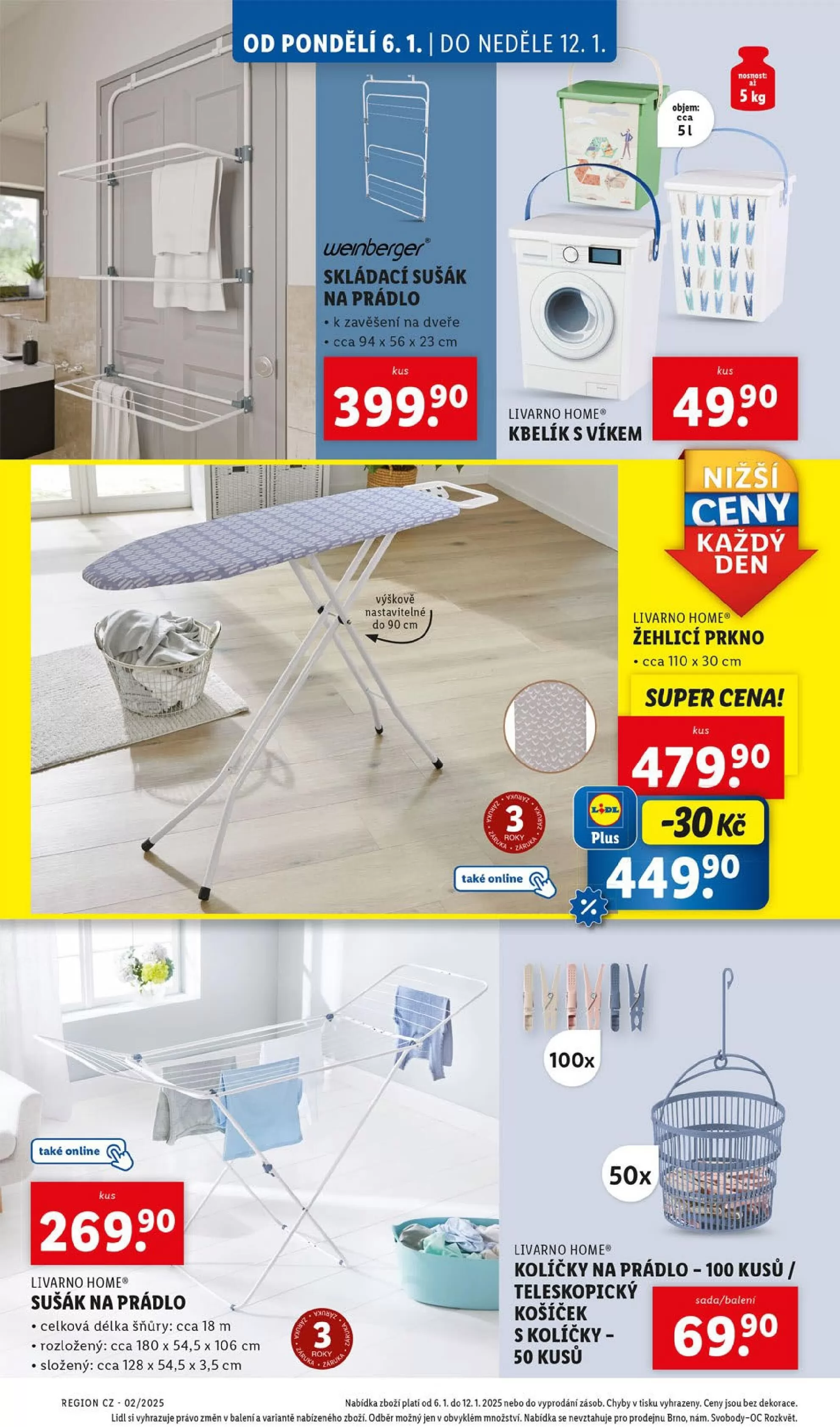Od pondělí 6.1. do neděle 12.1. si v Lidlu můžete pořídit skvělé produkty pro domácnost. Nabízíme skládací sušák na prádlo za 399 Kč, který je ideální k zavěšení na dveře a má rozměry cca 94 x 56 x 23 cm. Dále máme výškově nastavitelný kbelík s víkem za 49 Kč, který má objem cca 51 litrů.