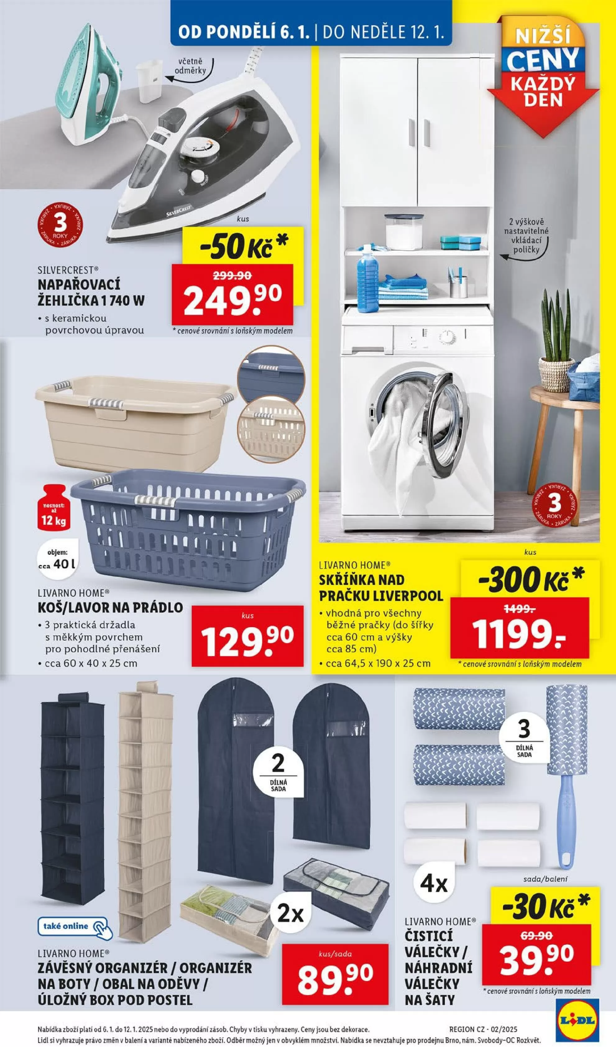 Od pondělí 6.1. do neděle 12.1. si v Lidlu můžete vybrat z široké nabídky produktů. Mezi nimi najdete napařovací žehličku Silvercrest s keramickou povrchovou úpravou a výkonem 1740 W, která je nyní za zvýhodněnou cenu. Dále je v nabídce koš na prádlo Livarno Home s praktickými držadly pro pohodlné přenášení.