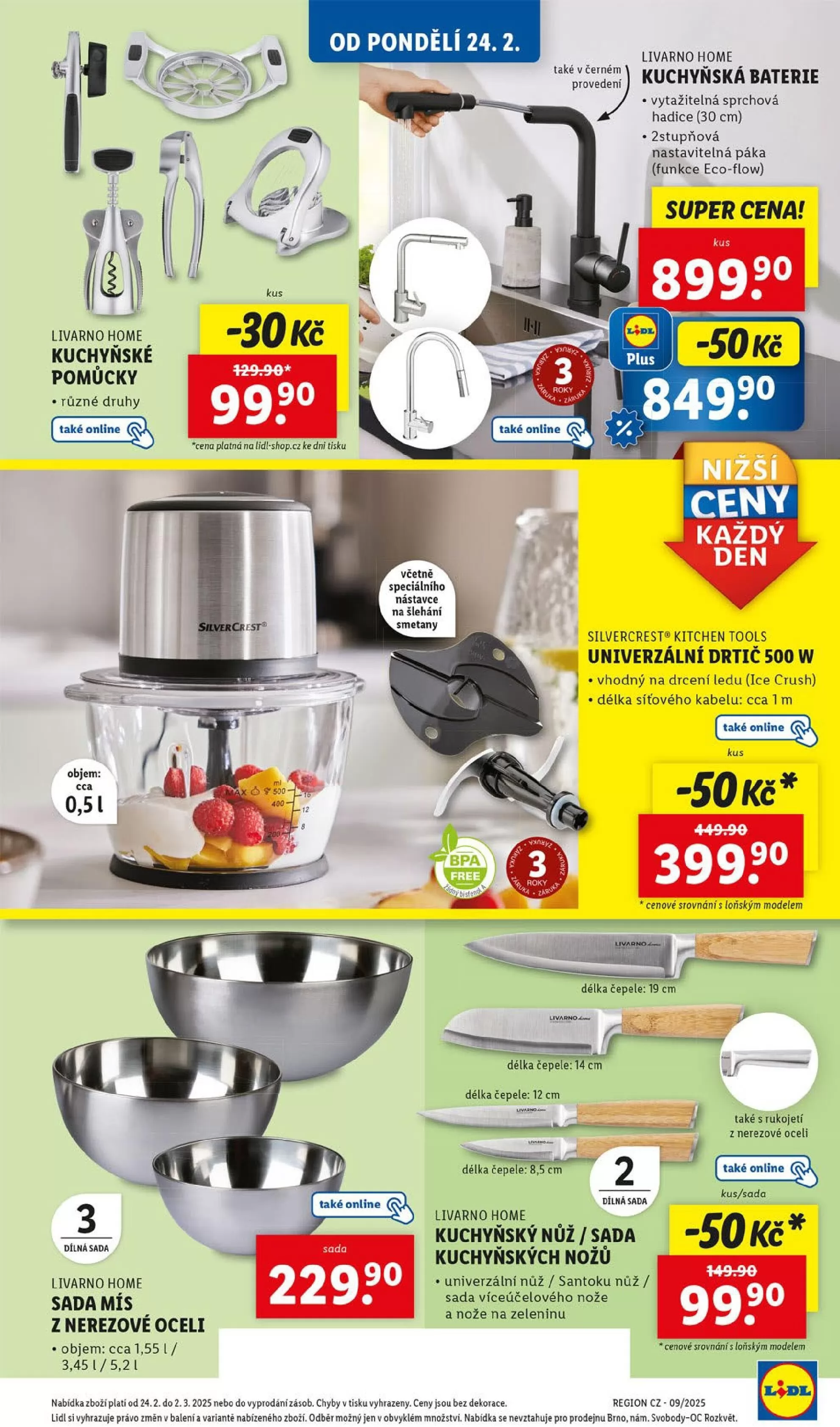 Dále nabízíme různé kuchyňské pomůcky Livarno Home, které jsou také dostupné online. Sada mís z nerezové oceli s objemem 1,55 l, 3,45 l a 5,21 l je k dostání za 229 Kč.